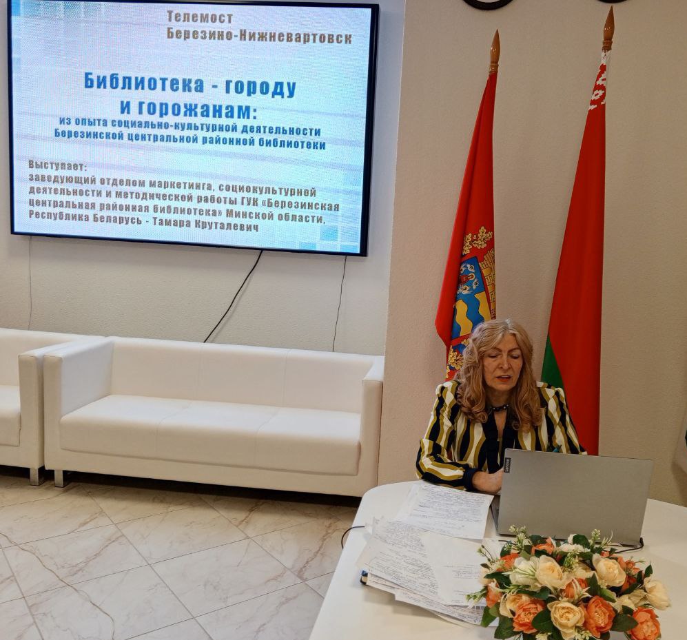 В канун дня объединения народов Беларуси и России состоялся телемост между ГУК «Березинская центральная районная библиотека» и Центральной городской библиотекой имени М.К Анисимковой г. Нижневартовска «Библиотека-городу и горожанам». Вначале участники обменялись презентациями рекламных визитных карточек городов с акцентом на достопримечательности и местные культурные традиции, затем представили выступления с изложением опыта. Заведующий отделом маркетинга, социокультурной деятельности и методической работы Березинской ЦБ Круталевич Т.Н. представила лучшее из лучшего из творческого досье Березинской районной библиотеки в работе с различными категориями горожан. Заведующая Центральной городской библиотекой имени М.К. Анисимковой Ирина Ефимова прорекламировала специализированные отделы библиотеки и формы работы, востребованные у местного населения: литературный сквер, анти-кафе, арт-пространство для рабочей молодёжи, имперсивный театр, залы русского быта и редкой книги… Российских коллег заинтересовали формы массовой работы березинских библиотекарей: литературный мальчишник, молодёжная рулетка, диалоги с Маской откровения, семейный блок мероприятий (праздник братьев и сестёр, субботы семейного согласия, форумы отцов и сыновей, вечера-посвящения «Дочки-матери», дни почтения бабушек), краеведческий вокзал, цикл вечеров оживших биографий земляков, импровизированные литературные игры «Герой не своего романа» . Телемост оправдал ожидания, позволил обменяться новациями, наметить точки дальнейшего сотрудничества.