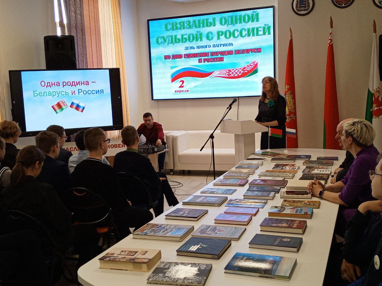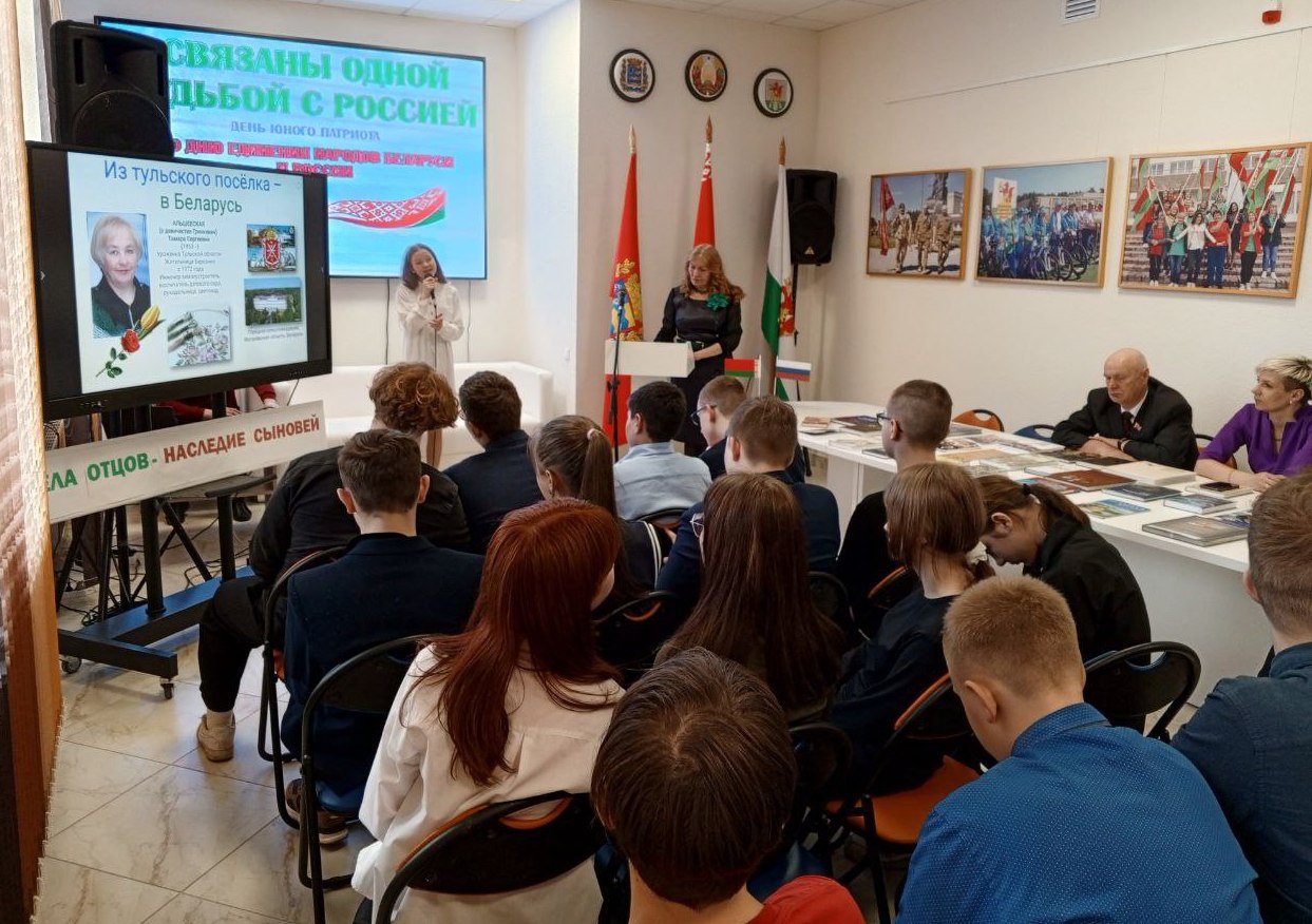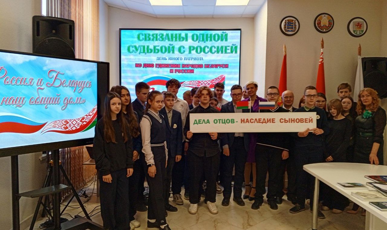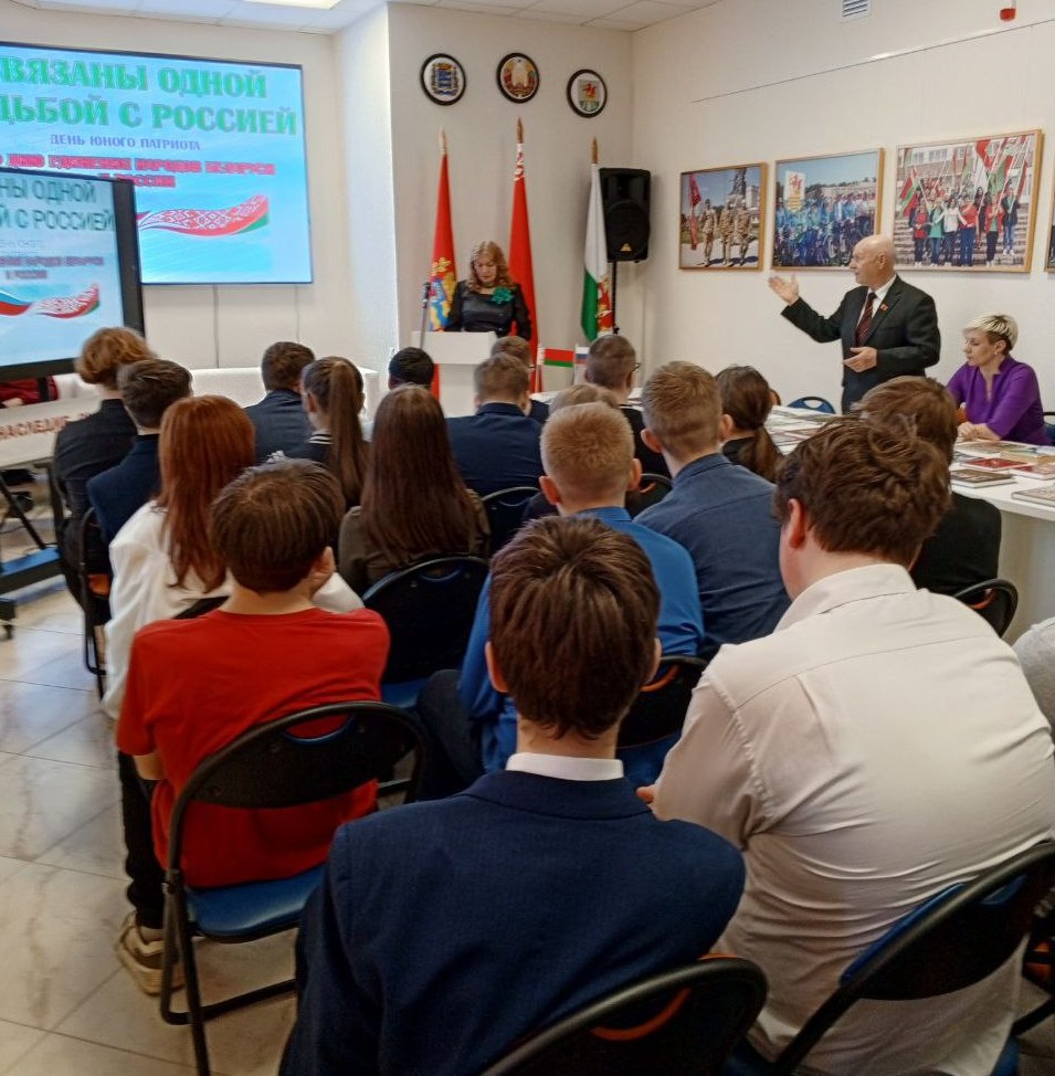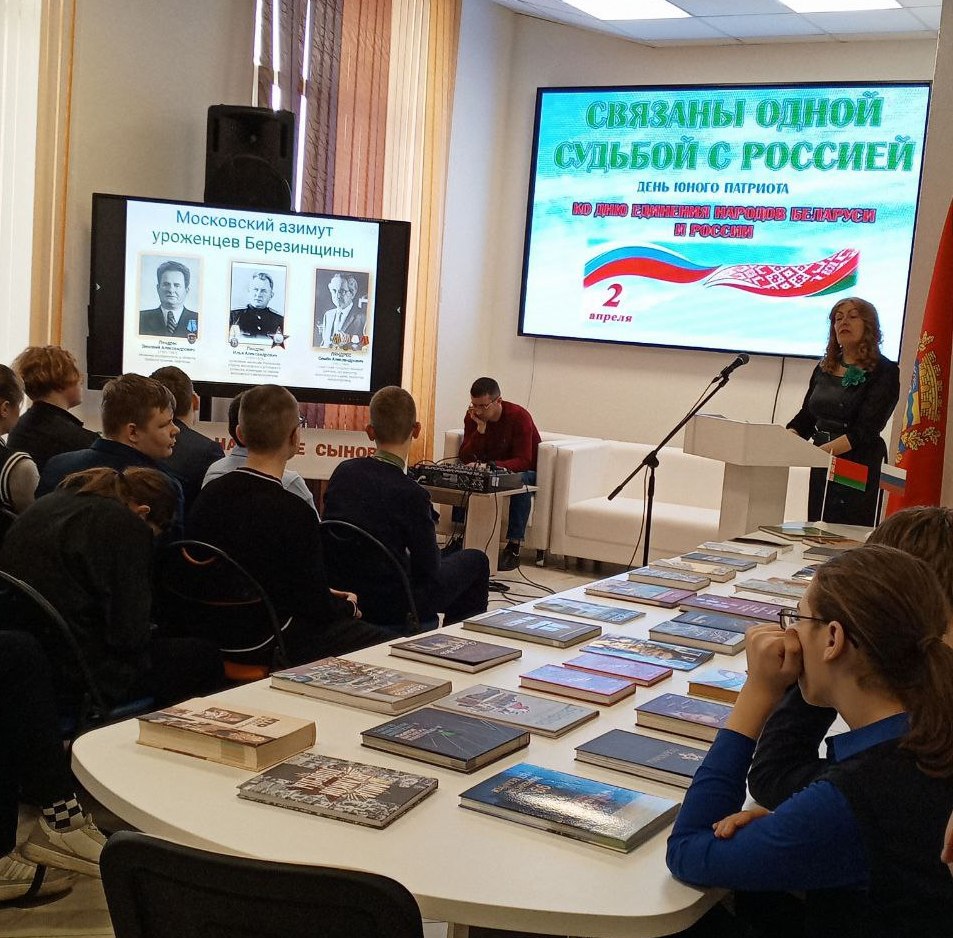 День единения народов Беларуси и России – праздник, символизирующий общность исторических судеб, многовековую крепкую дружбу и духовное братство белорусов и россиян. Этой дате был посвящен день юного патриота «СВЯЗАНЫ ОДНОЙ СУДЬБОЙ С РОССИЕЙ», который собрал старшеклассников Березинской гимназии в стенах ГУК «Березинская центральная районная библиотека». Сегодня подчеркивать наше единство с Россией актуально, как никогда. Молодое поколение призвано расти на традициях духовного братства. Патриотизм и братство – духовная доминанта общества, наша сила. Об этом говорили молодым современникам представитель поколения СССР, дипломированный историк, председатель районного совета ветеранов, член Березинской районной организации Коммунистической партии Беларуси Анатолий Зябко и первый секретарь БРСМ Екатерина Аврамчик. Прочувствовать вековую дружбу и духовное единство белорусов и россиян позволили яркие судьбы земляков, которыми гордятся и белорусы, и россияне. Гордость Березинщины, гордость России – уроженцы д. Боровино братья Ляндресы, достойно писавшие свою трудовую биографию в Москве: изобретатель в области турбиностроения, кавалер ордена Трудового Красного Знамени Зиновий Александрович; начальник отдела Московского уголовного розыска, орденоносный полковник, командир отдельного дивизиона по охране Московского метрополитена Илья Александрович; помощник наркома тяжёлой промышленности СССР, директор Гослитиздата, член комиссии по литературному наследию Булгакова, отец писателя Ю. Семёнова – автора киноромана «17 мгновений весны» Семён Александрович. Связаны одной судьбой с Россией уроженка д. Богушевичи, профессор медицины, отличник здравоохранения Беларуси Лидия Ломако; уроженка Дагестана, участница войны, жительница Березино с 2013-2022гг. Галина Могилко (Есауленко); уроженка Тульской области Тамара Альшевская. 30 лет назад поменяла Крым на Беларусь многодетная семья Ганиных. Судьбы героев мероприятия ко Дню единения Беларуси и России – свидетельство братства наших народов. У нас – общая культура и традиции. И общие песни, которые представили публике юные артисты Березинской школы искусств.