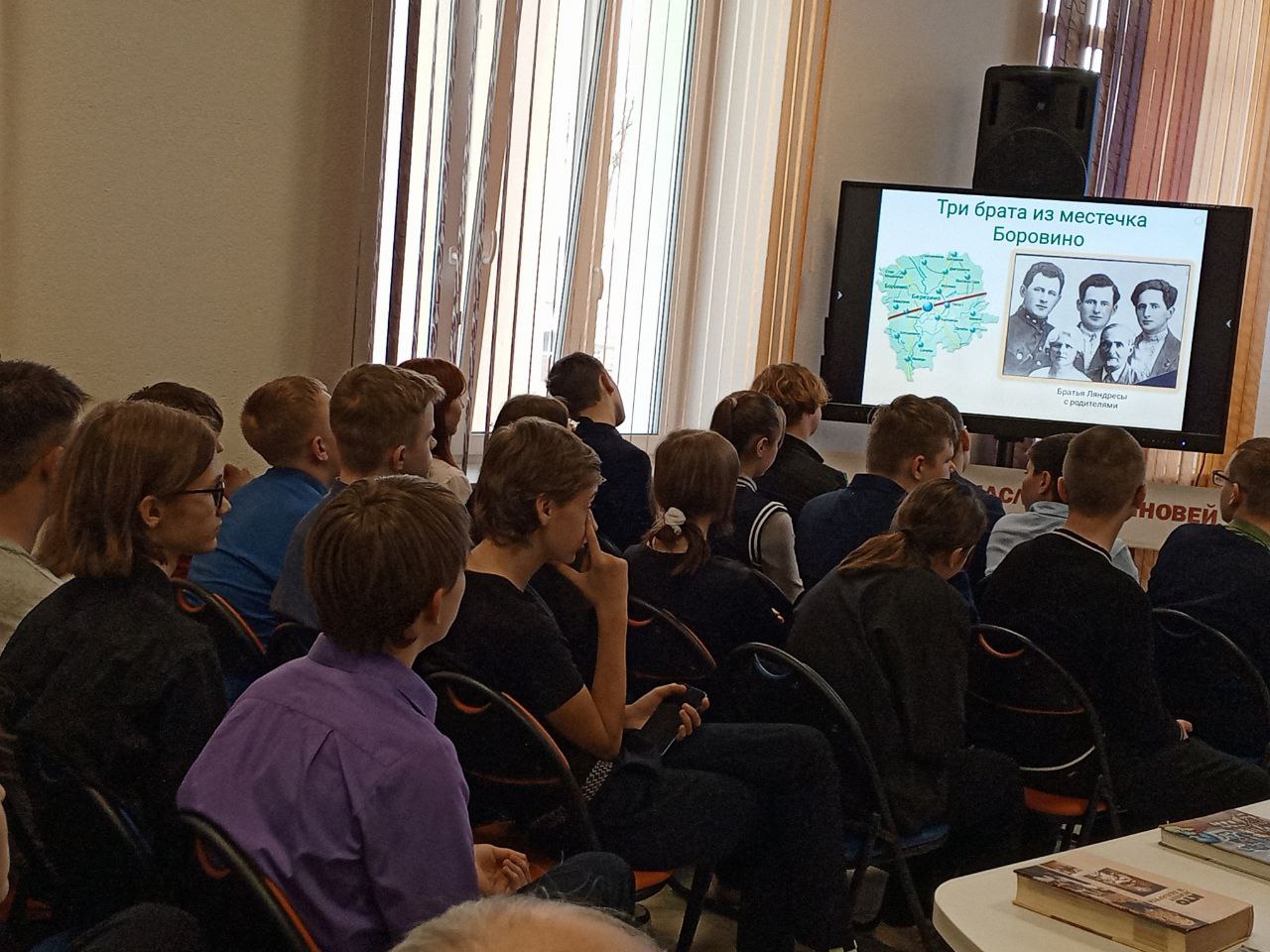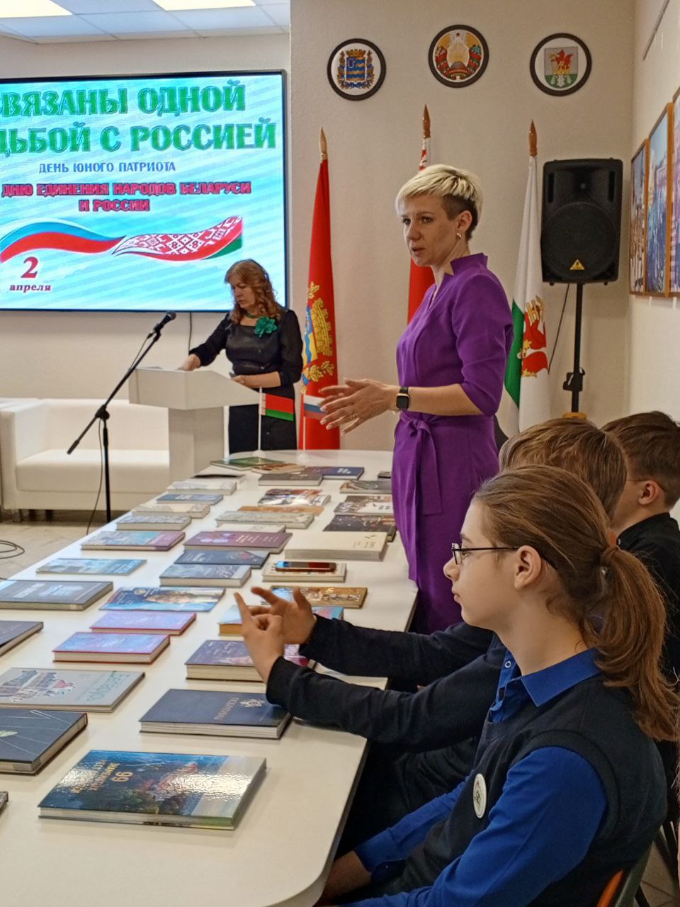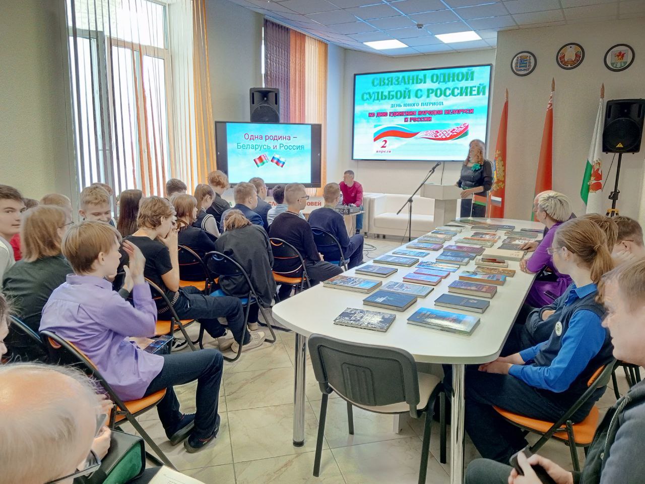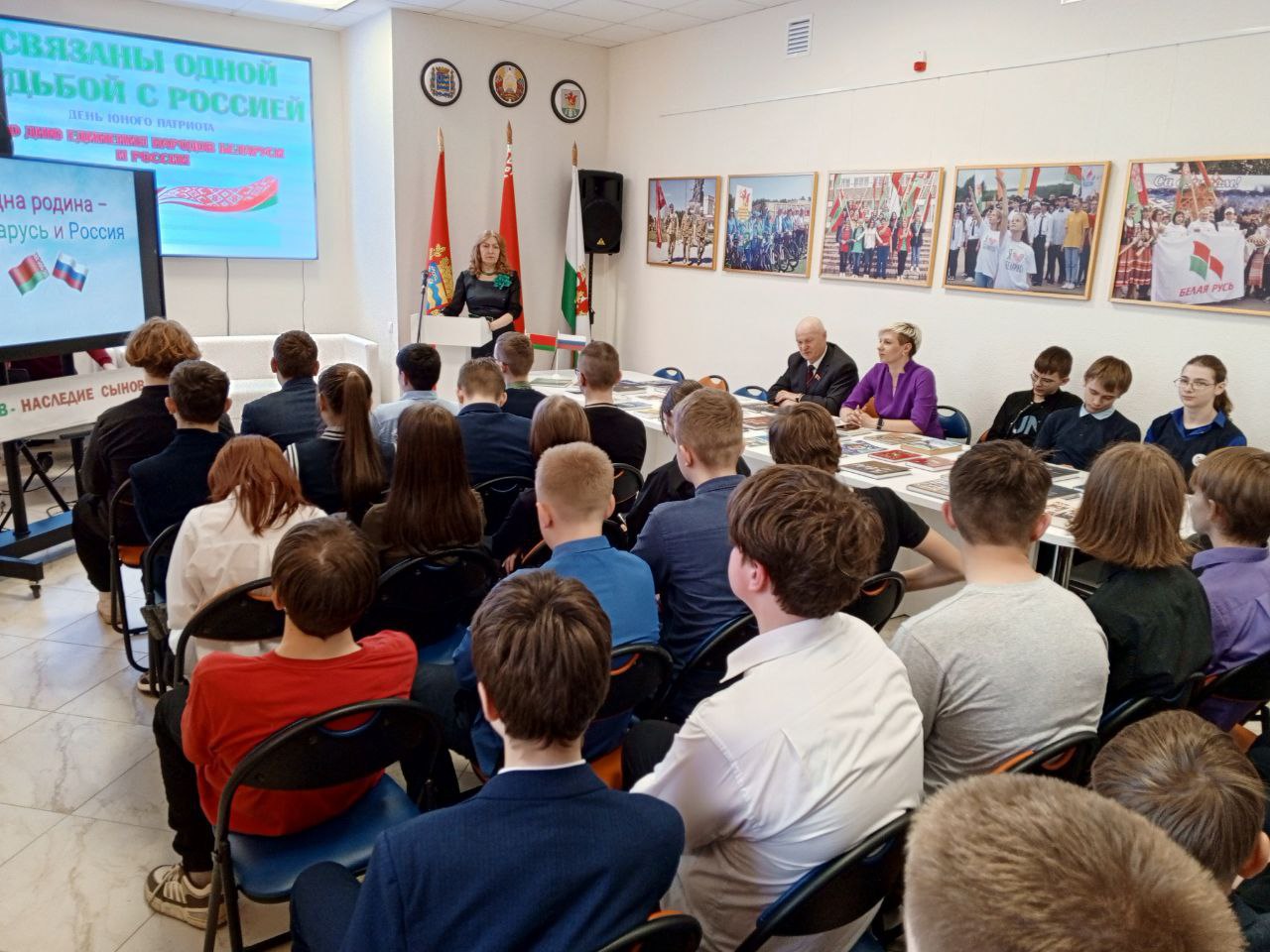 День единения народов Беларуси и России – праздник, символизирующий общность исторических судеб, многовековую крепкую дружбу и духовное братство белорусов и россиян. Этой дате был посвящен день юного патриота «СВЯЗАНЫ ОДНОЙ СУДЬБОЙ С РОССИЕЙ», который собрал старшеклассников Березинской гимназии в стенах ГУК «Березинская центральная районная библиотека». Сегодня подчеркивать наше единство с Россией актуально, как никогда. Молодое поколение призвано расти на традициях духовного братства. Патриотизм и братство – духовная доминанта общества, наша сила. Об этом говорили молодым современникам представитель поколения СССР, дипломированный историк, председатель районного совета ветеранов, член Березинской районной организации Коммунистической партии Беларуси Анатолий Зябко и первый секретарь БРСМ Екатерина Аврамчик. Прочувствовать вековую дружбу и духовное единство белорусов и россиян позволили яркие судьбы земляков, которыми гордятся и белорусы, и россияне. Гордость Березинщины, гордость России – уроженцы д. Боровино братья Ляндресы, достойно писавшие свою трудовую биографию в Москве: изобретатель в области турбиностроения, кавалер ордена Трудового Красного Знамени Зиновий Александрович; начальник отдела Московского уголовного розыска, орденоносный полковник, командир отдельного дивизиона по охране Московского метрополитена Илья Александрович; помощник наркома тяжёлой промышленности СССР, директор Гослитиздата, член комиссии по литературному наследию Булгакова, отец писателя Ю. Семёнова – автора киноромана «17 мгновений весны» Семён Александрович. Связаны одной судьбой с Россией уроженка д. Богушевичи, профессор медицины, отличник здравоохранения Беларуси Лидия Ломако; уроженка Дагестана, участница войны, жительница Березино с 2013-2022гг. Галина Могилко (Есауленко); уроженка Тульской области Тамара Альшевская. 30 лет назад поменяла Крым на Беларусь многодетная семья Ганиных. Судьбы героев мероприятия ко Дню единения Беларуси и России – свидетельство братства наших народов. У нас – общая культура и традиции. И общие песни, которые представили публике юные артисты Березинской школы искусств.