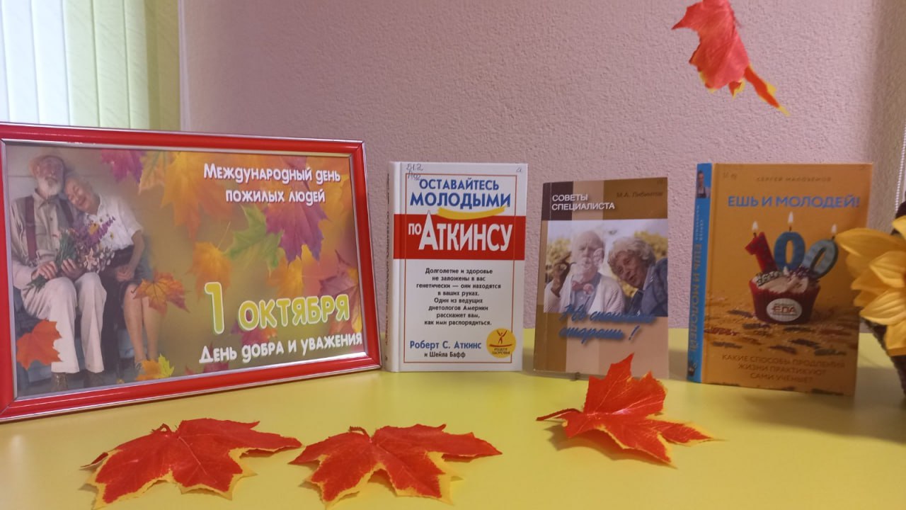 Международный день пожилых людей ежегодно отмечается 1 октября с 1991 года. Учреждён Генеральной Ассамблеей ООН. День пожилого человека — праздник чистый и светлый, праздник наших родителей, бабушек и дедушек, день, когда мы отдаем им свою любовь, уважение и признательность. Не секрет, что люди старшего поколения, воспитанные книгой, остаются верными ей на протяжении всей жизни. Но найти в потоке новинок свою книгу, которая попадет в самое сердце, бывает непросто, но только не в ГУК "Березинская центральная районная библиотека". К этому празднику для ВАС наши любимые читатели оформлена выставка »Гармония с возрастом». На ней представлены книги о здоровом образе жизни, о правильном питании с рецептами полезных блюд, книги о том, как превратить дачный участок в райский уголок! И конечно же романы, где писатели рассказывают про красоту зрелой любви, которая раскрывается через судьбы героинь и героев.