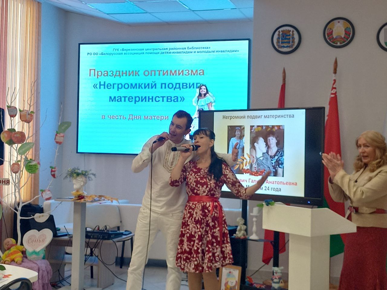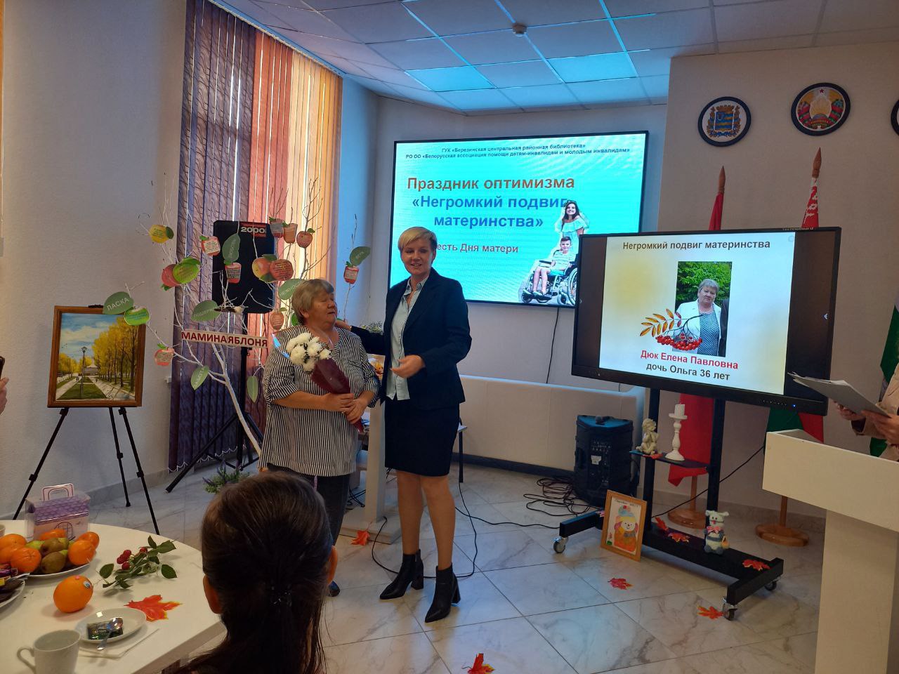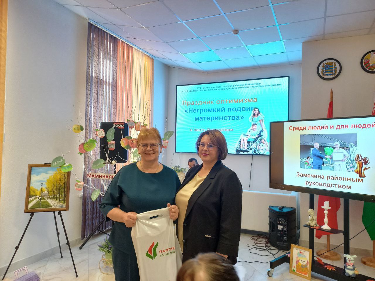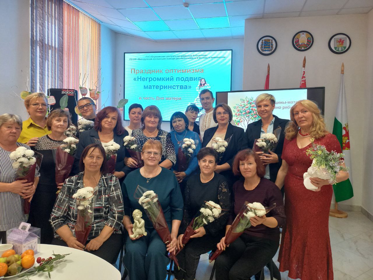 Ярким открытием Недели родительской любви на Березинщине стал праздник оптимизма «Негромкий подвиг материнства», который собрал в актовом зале Березинской районной библиотеки особый контингент матерей – членов РО ОО «Белорусская ассоциация помощи детям-инвалидам и молодым инвалидам». Изо дня в день, не претендуя на похвалу, они буднично и кротко совершают настоящий подвиг, являясь земными ангелами для своих детей с физическими ограничениями. С приветственными словами и подарками мам пришли поздравить директор Березинского ТЦСОН Желудева Е.Д., председатель профсоюза работников АПК Аврамчик Е.Ю. Звучали слова благодарности в адрес первого и нынешнего председателей районного объединения БелАПДИиМИ Булгак Т.В. и Вергейчик Н.В., которые 25 лет назад смогли создать особенный союз особенных матерей на принципах взаимопомощи, взаимовыручки, доверия. Сотрудники библиотеки подготовили рекламную презентацию «Негромкий подвиг материнства» в честь самоотверженных матерей, которые, вопреки недугу детей, помогают им социализироваться, ощущать себя полноценными членами общества. Тонус позитива внесли лирические песни в исполнении березинских самодеятельных артистов Антонюка Александра и Бобрович Галины и сеанс смехотерапии под девизом «Веселая мама – счастливая мама». Мамина яблоня порадовала «яблочками мудрости». В зале царила особая аура добрых слов, сердечных эпитетов и благодарностей. Мамы делились не тревогами и проблемами, а сокровенными улыбками и хорошим настроением.