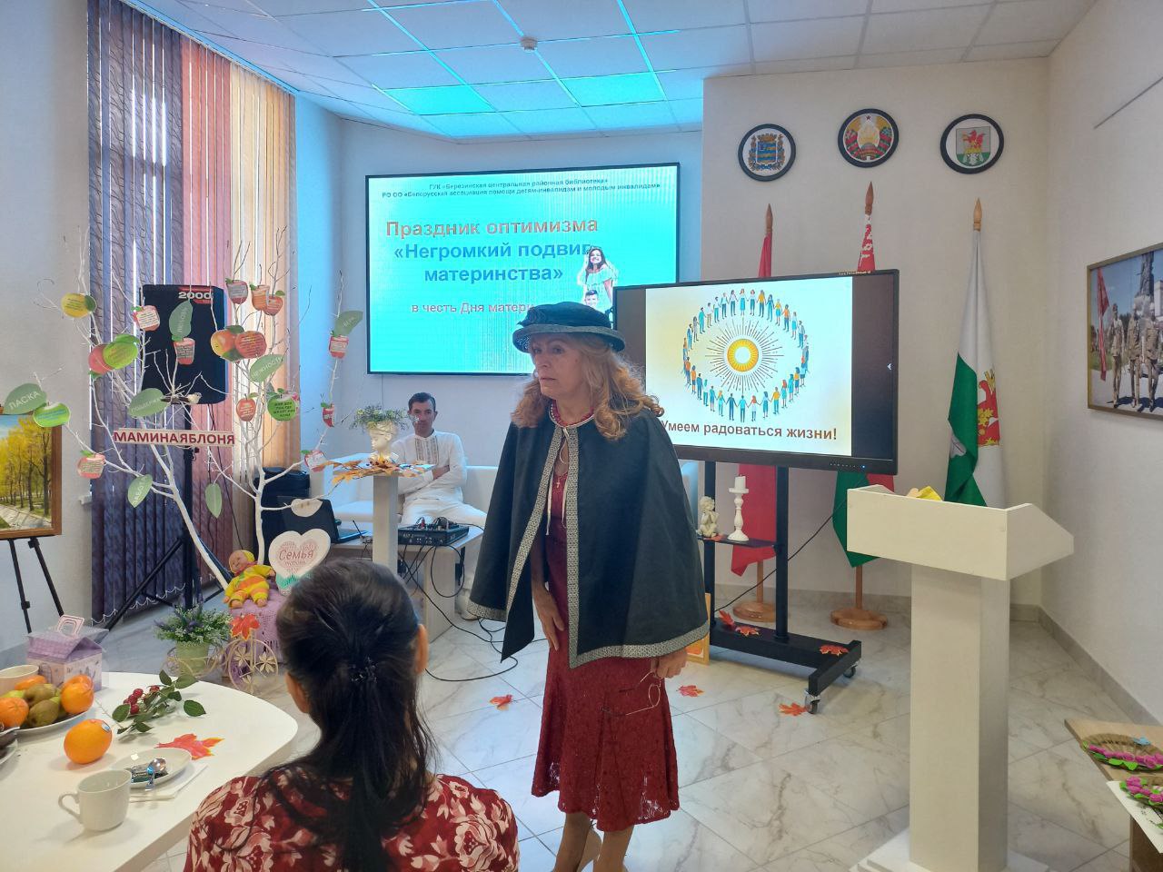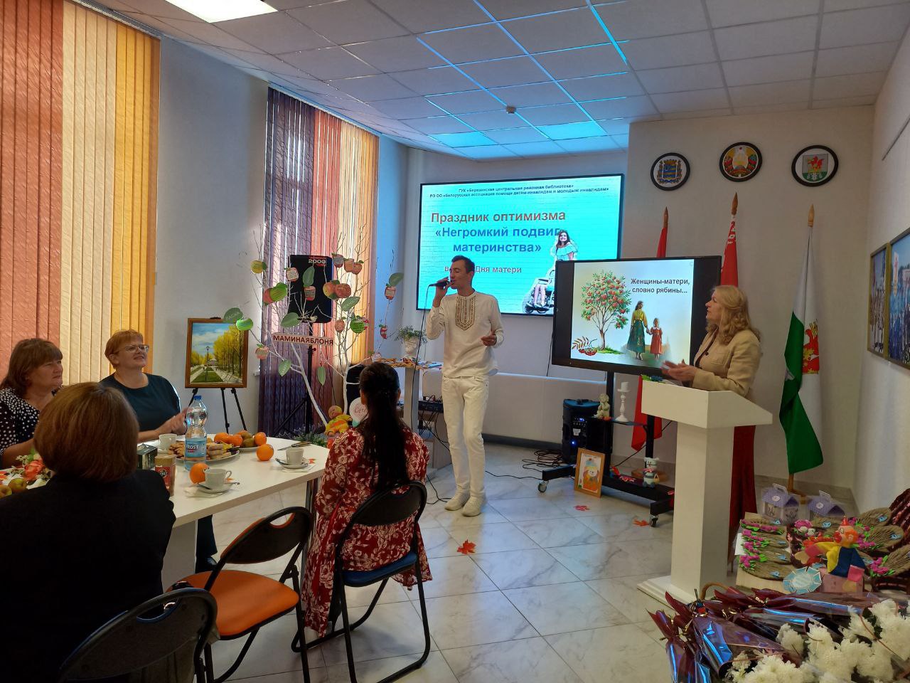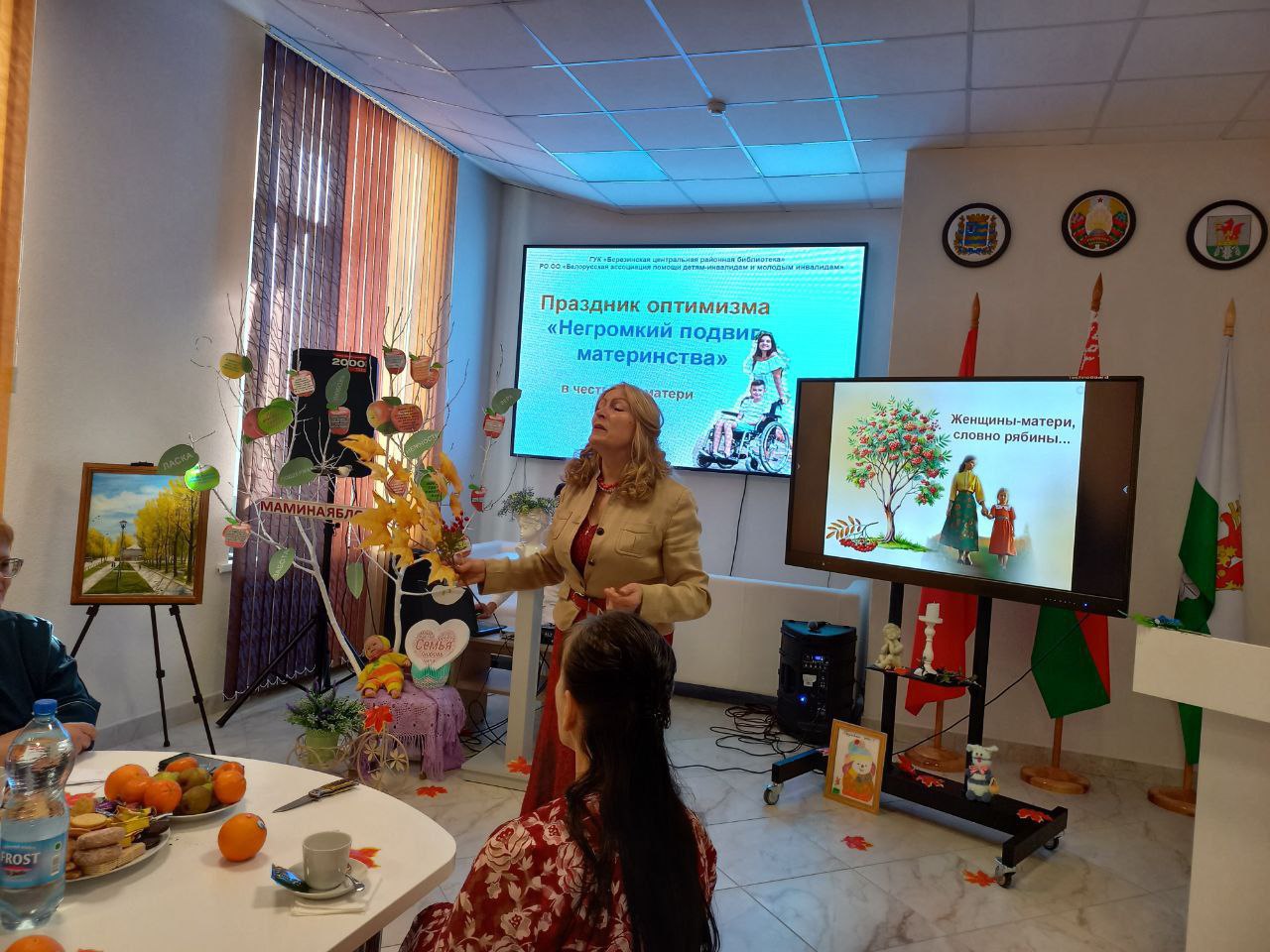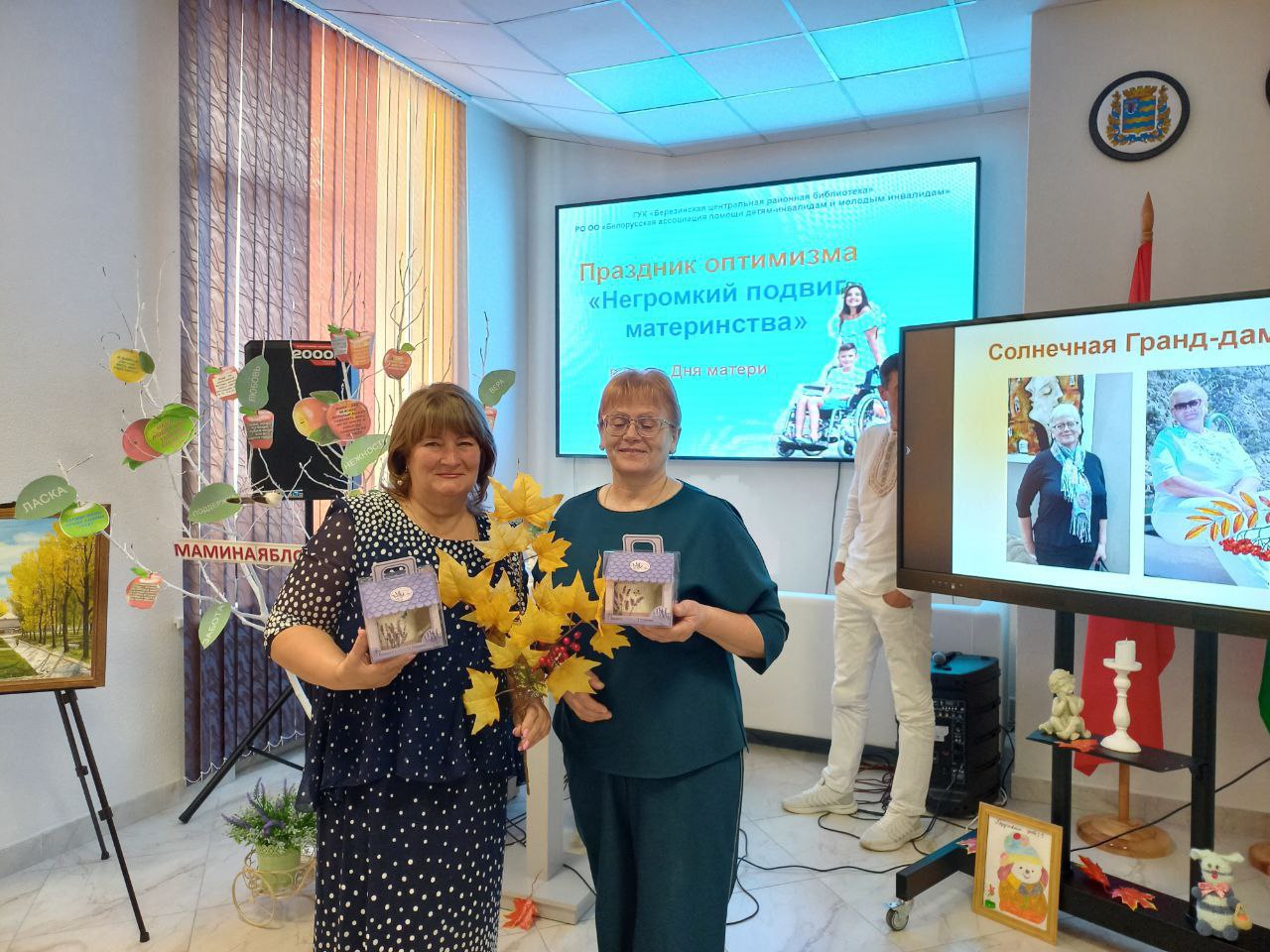 Ярким открытием Недели родительской любви на Березинщине стал праздник оптимизма «Негромкий подвиг материнства», который собрал в актовом зале Березинской районной библиотеки особый контингент матерей – членов РО ОО «Белорусская ассоциация помощи детям-инвалидам и молодым инвалидам». Изо дня в день, не претендуя на похвалу, они буднично и кротко совершают настоящий подвиг, являясь земными ангелами для своих детей с физическими ограничениями. С приветственными словами и подарками мам пришли поздравить директор Березинского ТЦСОН Желудева Е.Д., председатель профсоюза работников АПК Аврамчик Е.Ю. Звучали слова благодарности в адрес первого и нынешнего председателей районного объединения БелАПДИиМИ Булгак Т.В. и Вергейчик Н.В., которые 25 лет назад смогли создать особенный союз особенных матерей на принципах взаимопомощи, взаимовыручки, доверия. Сотрудники библиотеки подготовили рекламную презентацию «Негромкий подвиг материнства» в честь самоотверженных матерей, которые, вопреки недугу детей, помогают им социализироваться, ощущать себя полноценными членами общества. Тонус позитива внесли лирические песни в исполнении березинских самодеятельных артистов Антонюка Александра и Бобрович Галины и сеанс смехотерапии под девизом «Веселая мама – счастливая мама». Мамина яблоня порадовала «яблочками мудрости». В зале царила особая аура добрых слов, сердечных эпитетов и благодарностей. Мамы делились не тревогами и проблемами, а сокровенными улыбками и хорошим настроением.