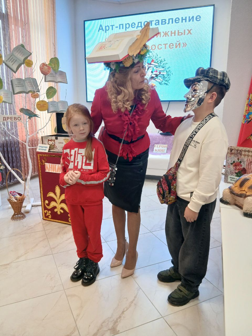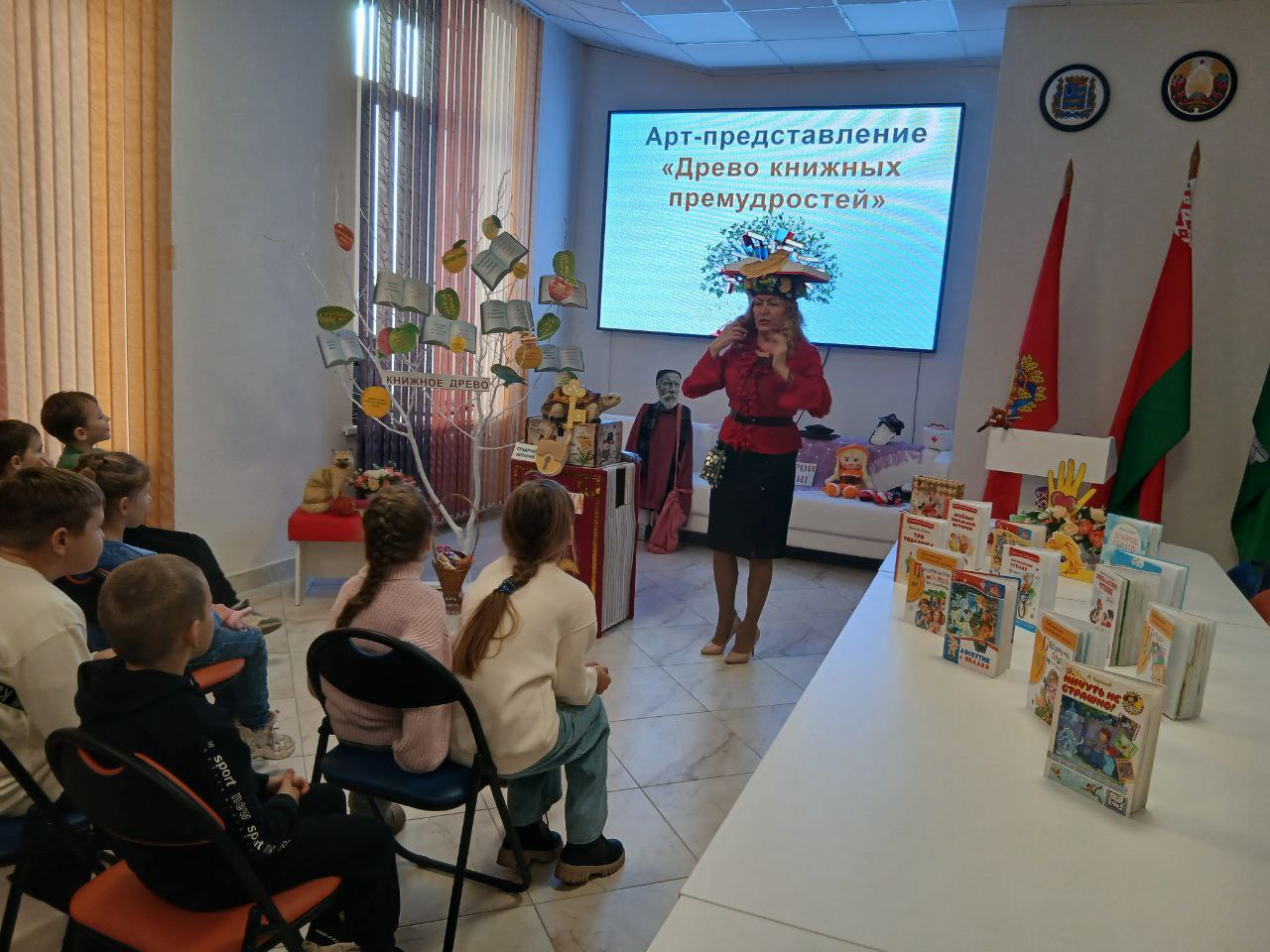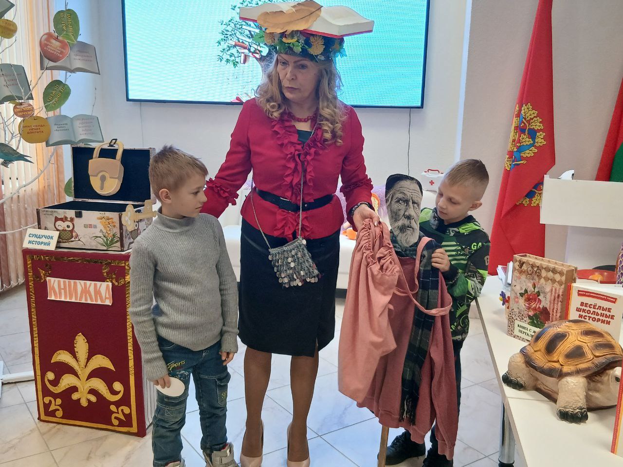 “У книг не бывает каникул!”, - под таким лейтмотивом проходят мероприятия Березинской центральной районной библиотеки по стимуляции активного чтения детей и подростков в период осенних каникул. Откликом на агит-кампанию “На каникулы- в библиотеку!” стал коллективный поход воспитанников оздоровительного лагеря СШ № 3 г. Березино в главную библиотеку города, где им была представлена интерактивная форма пропаганды лучших произведений советских авторов. Оживил страницы рассказов арт-показ “Древо книжных премудростей” с импровизированным подключением самих зрителей под девизом “Герои книг- герои дня” . Порадовали ребят: книжное дерево с яблочками мудрости, учёный Кот и мудрая Черепаха, сундучок предметов-символов . Такое коллективное прочтение рассказов позволило ребятам проявить свои артистических способности и создать яркие, запоминающиеся образы,а также стало хорошей рекламой ценностей художественных произведений о дружбе, милосердии, добрых поступках, взаимоотношениях с одноклассниками.