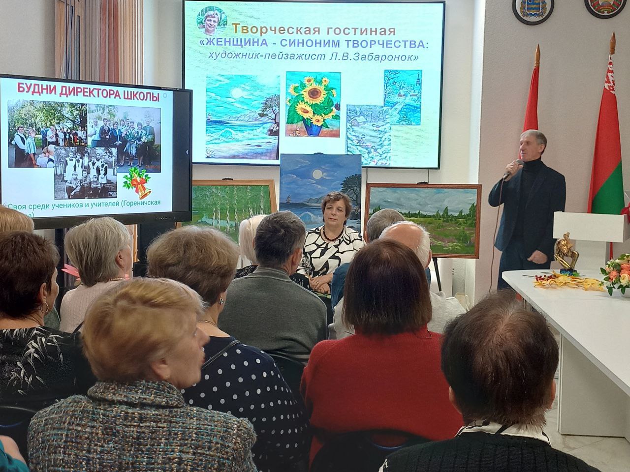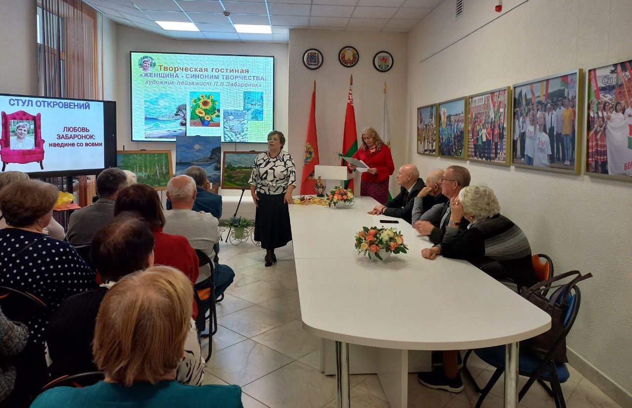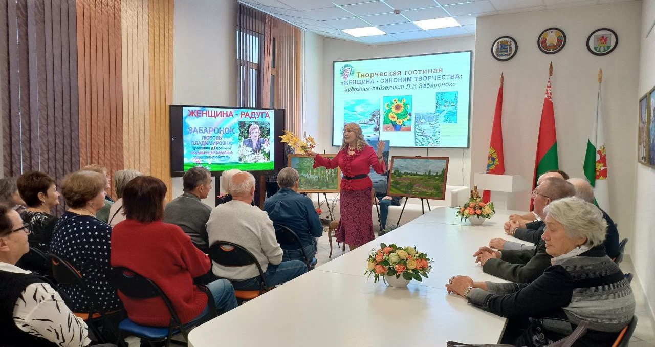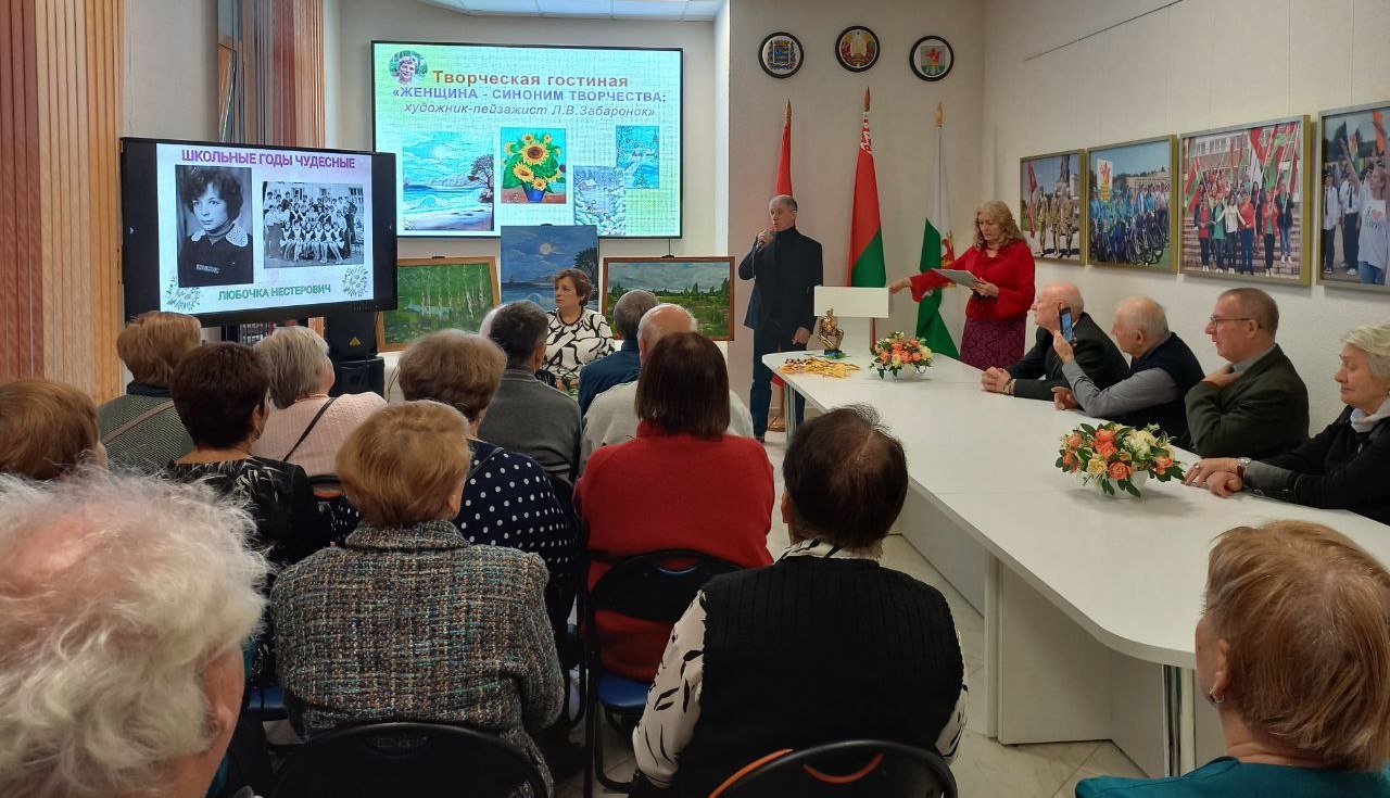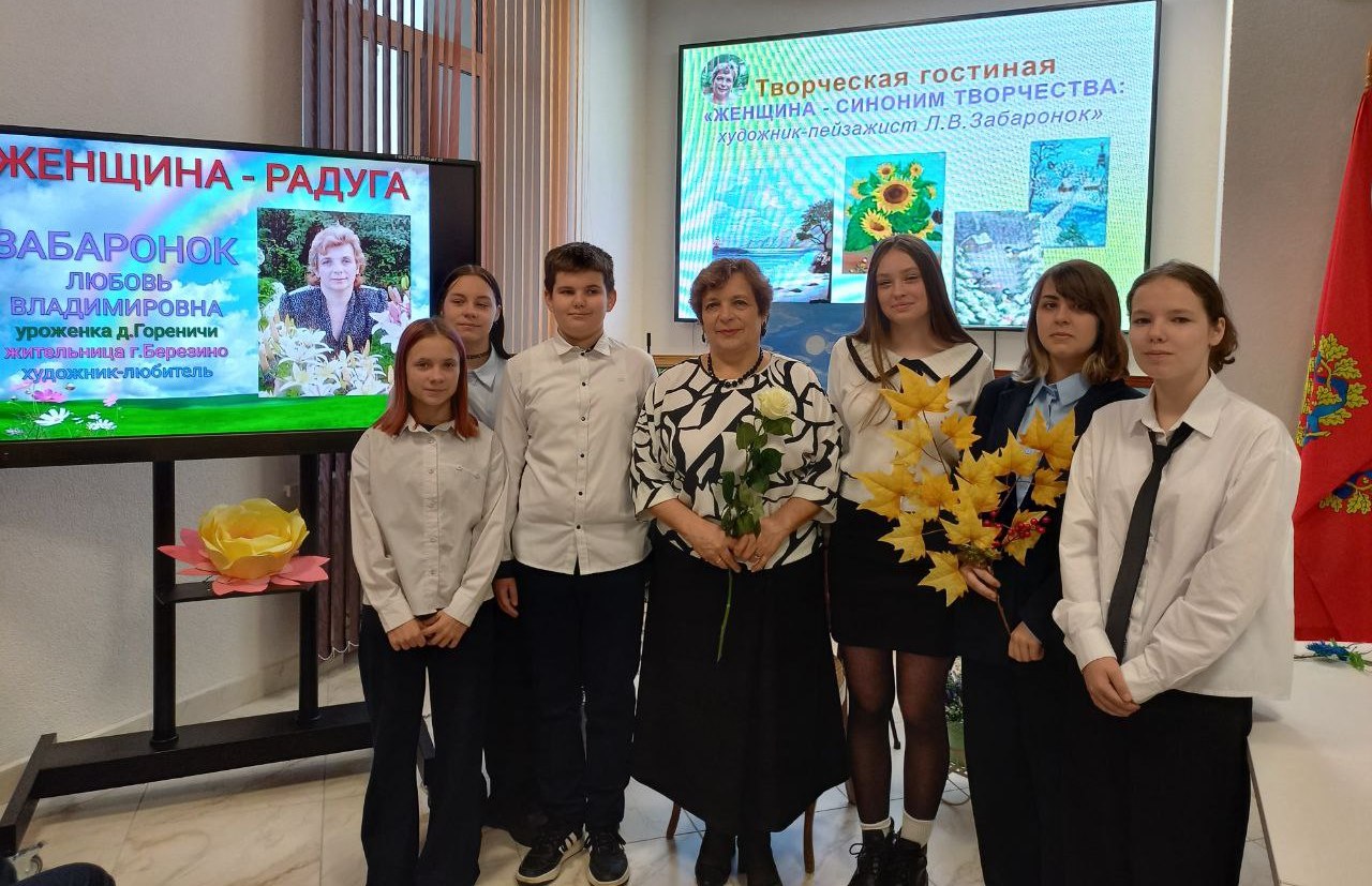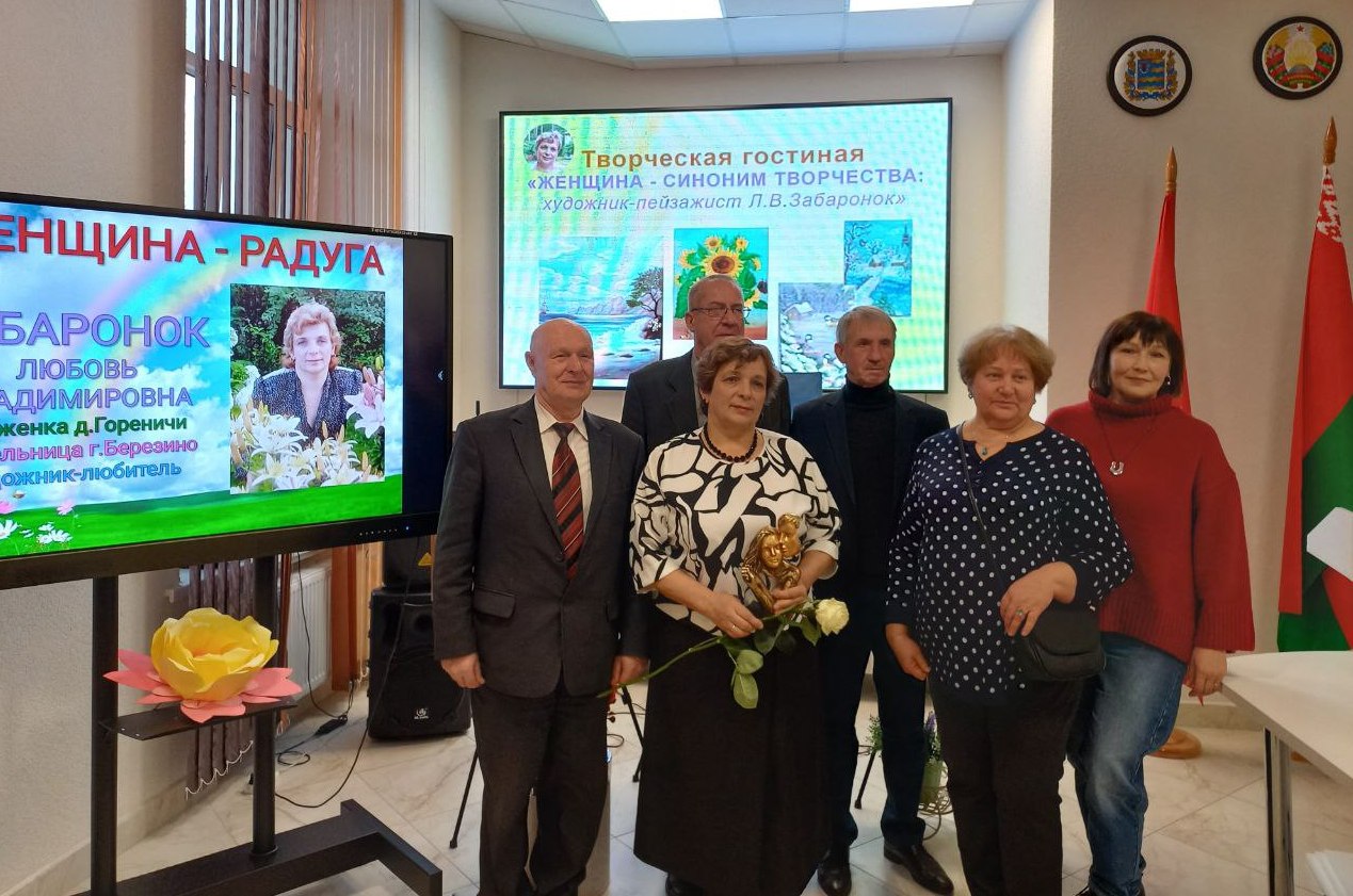 В холодный ноябрьский день сердце особенно просит тепла, тихого раздумья, общения с прекрасным. Высокое искусство спасает нас от уныния, от серости и грязи. Яркими красками эмоций была написана встреча в творческой гостиной “Женщина – синоним творчества” Березинской районной библиотеки с талантливой землячкой, уроженкой деревни Гореничи, ныне жительницей Березино Любовью Забаронок. Встреча стала приятной причиной приоткрыть занавес её творческой биографии, понять художника, перевернуть строки захватывающей книги её творчества. Имея внушительный послужной список - учитель географии и директор Гореничской школы, председатель Капланецкого сельского Совета, директор районного детского оздоровительного лагеря “Папараць-кветка”, учитель географии СШ № 2 г. Березино – Любовь Владимировна увлечена живописью, которая стала её потребностью высказаться и осмыслить жизнь через творчество. Природой вдохновлённая, она пишет завораживающие пейзажи, её картины – иллюстрация трепетной души художника, созданы в соавторстве с живой природой. Званая гостья украсила творческую гостиную блеском своей личности, предстала одухотворённо светлой, интеллигентно натуральной, поделилась с земляками сокровенными мыслями о своём творчестве, ответила на вопросы. Приятным сюрпризом для землячки стали выступления знающих её людей со словами искреннего восхищения её талантом и благодарности за ненаигранную интеллигентность и любовь к родному краю. Проникновенные мелодии под гитару в исполнении Николая Михайловского взлетали на бис и звучали золотой мелодией счастья, гениальной сонатой радости под аккомпанемент восторженных глаз посетителей творческой гостиной.