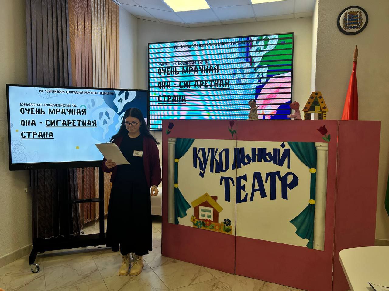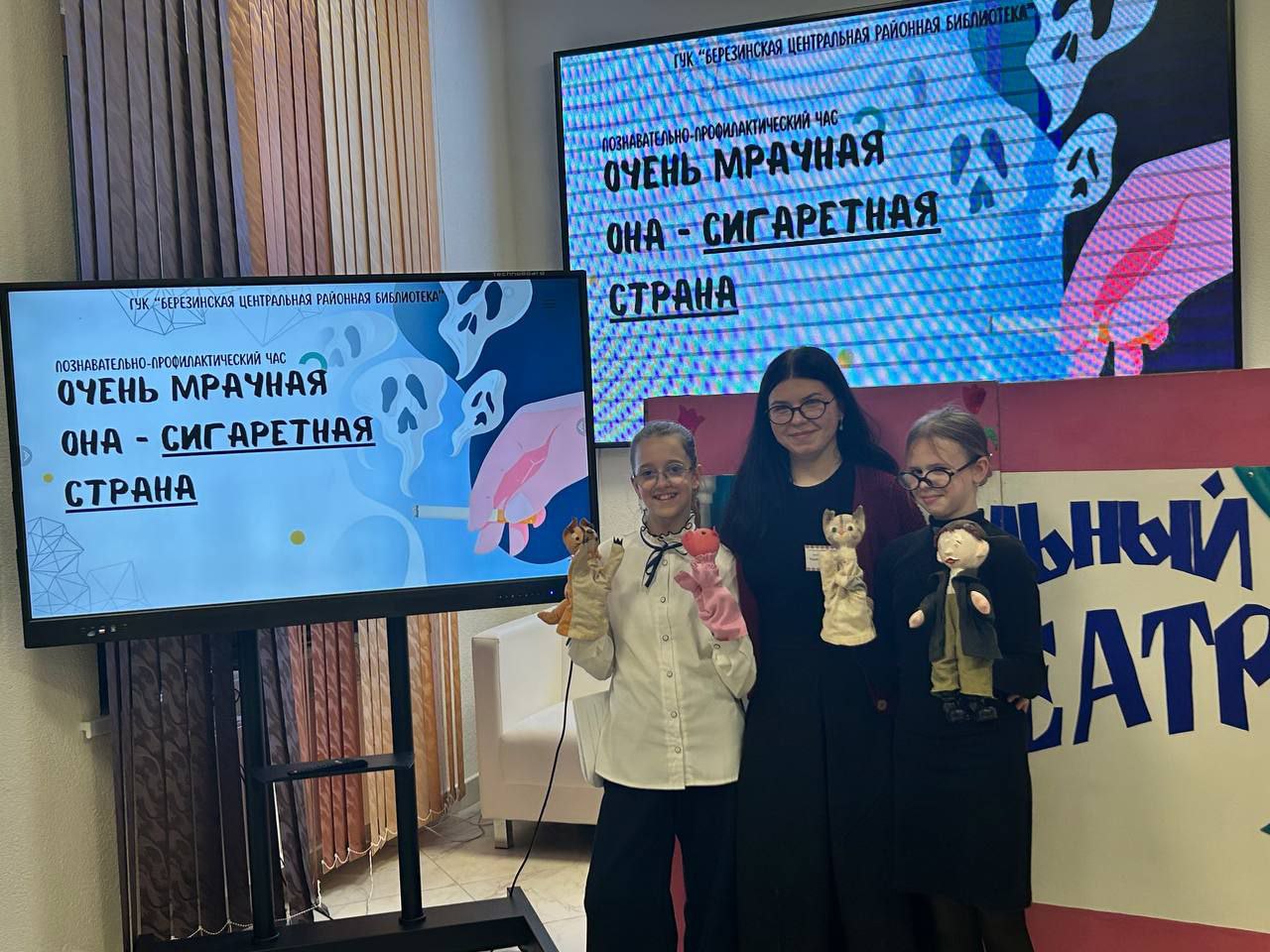 Для завершения мероприятия про запрет табачных изделий был представлен спектакль кукольного театра «Петрушка» под руководством работника детско-юношеского сектора Горошко Ульяны. Участники ловко продемонстрировали последствия от постоянного употребления табака, в последствии которого пагубно портится здоровье.