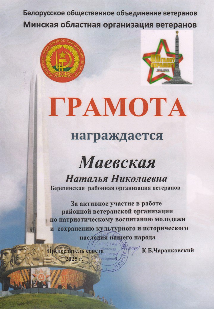 По итогам областного конкурса Белорусского общественного объединения ветеранов Минской области "Нужные люди - 2025" директор ГУК "Березинская центральная районная библиотека" Наталья Маевская награждена Грамотой в номинации "Минщина помнит".