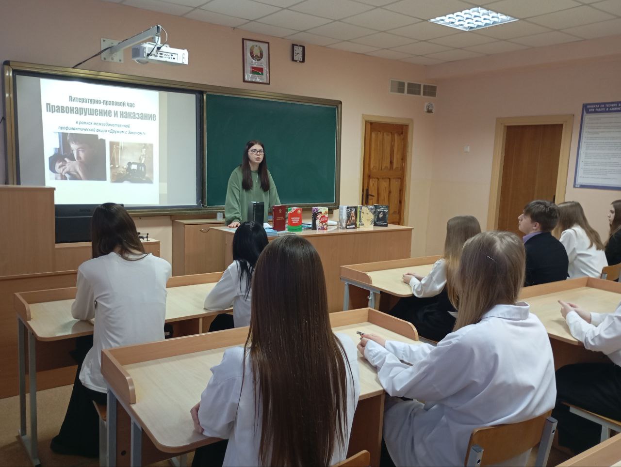 В рамках межведомственной профилактической акции «Дружим с законом!» сотрудниками детско-юношеского сектора ГУК "Березинская центральная районная библиотека" проведена беседа-диалог для учащихся средней школы №3 г. Березино с 10-м классом на тему "Профилактика психотропных веществ и кибербезопасность". Были затронуты самые острые темы современности, которые касаются каждого: "Скажи «НЕТ» психотропам", "Как не сломать жизнь за один миг и почему важно выбирать здоровый путь", "Цифровая броня: как распознать кибермошенника и не стать жертвой манипуляций в интернете" и другие.