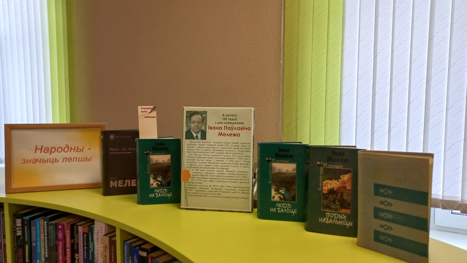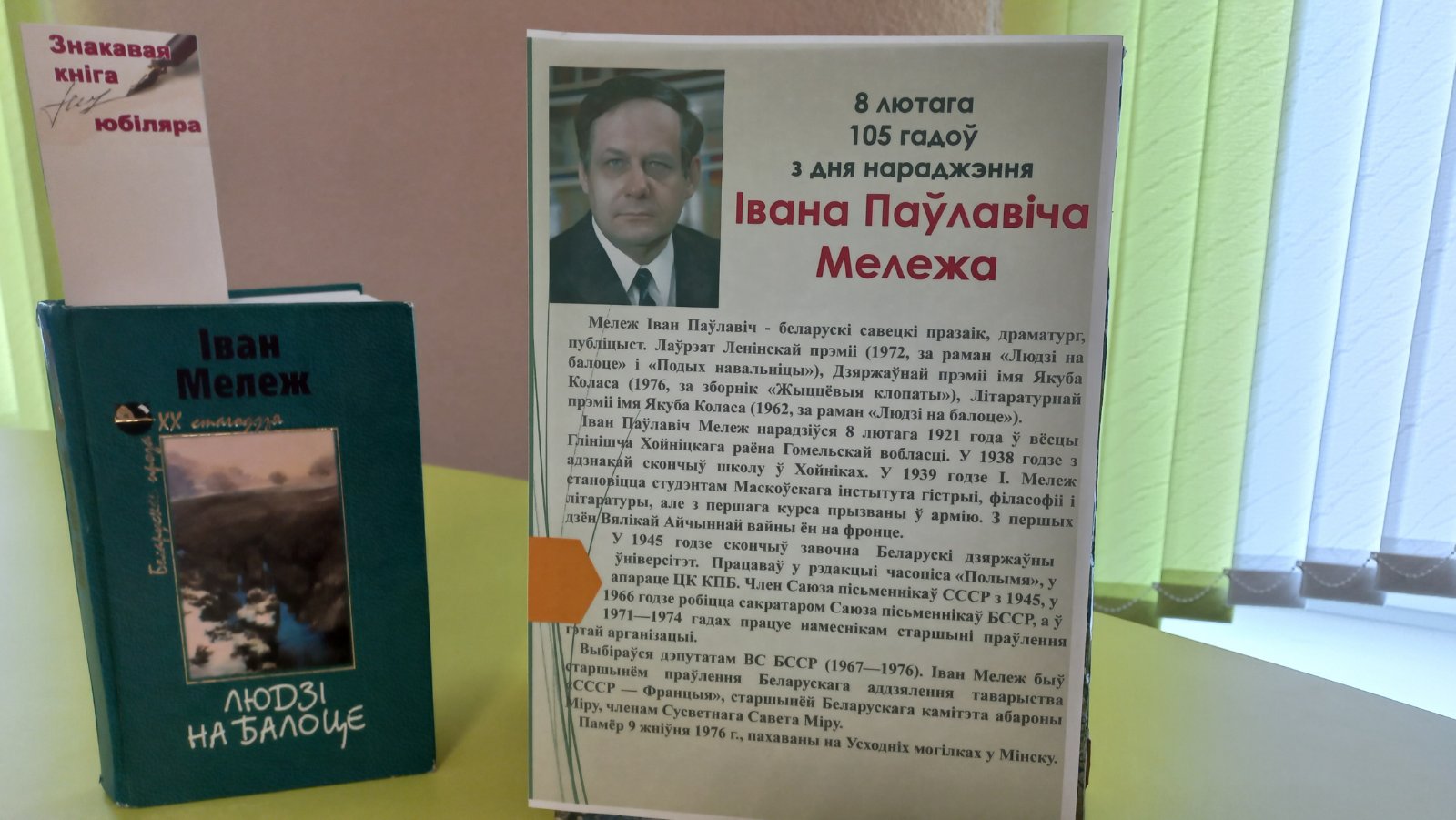 У рамках акцыі “Кожная пятніца-роднае, сваё” супрацоўнікі ГУК”Бярэзінская цэнтральная районная бібліятэка” пазнаёмілі чытачоў с творчасцю пісьменніка-юбіляра І.Мележа, якому 8 лютага споўнілася 105 гадоў з дня нараджэння. Дарэчы, вядомая кніга пісьменніка ”Людзі на балоцце”, якая ўвайшла ў залаты фонд беларускай літаратуры савецкага перыяду і стала класічным творам, які вывучаюць у вышэйшых установах адукацыі, адзначае селета 65-гадовы юбілей.