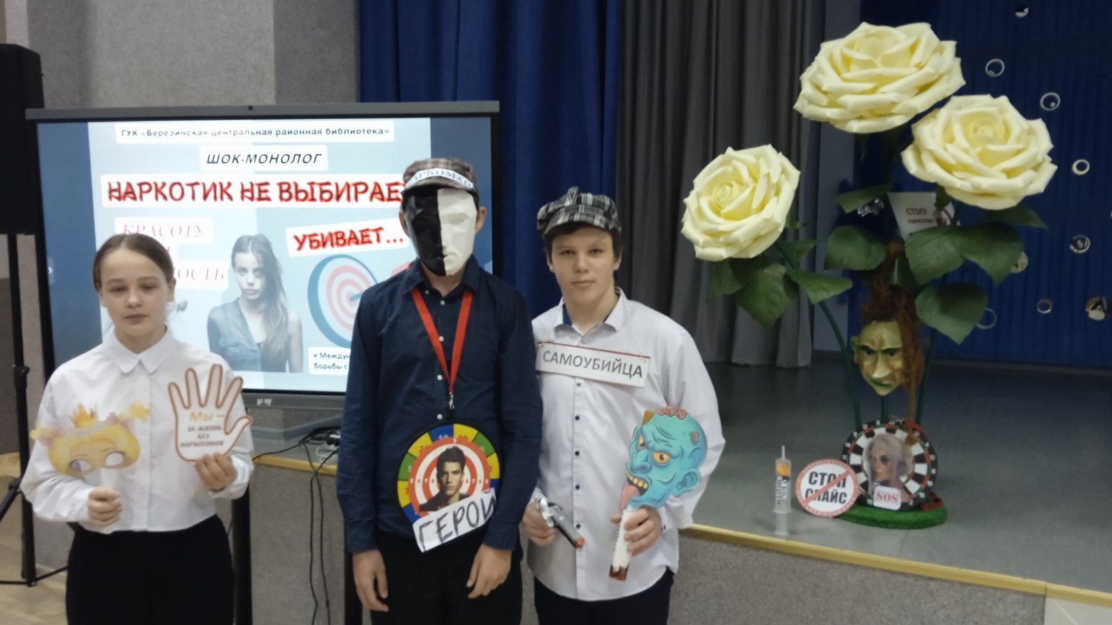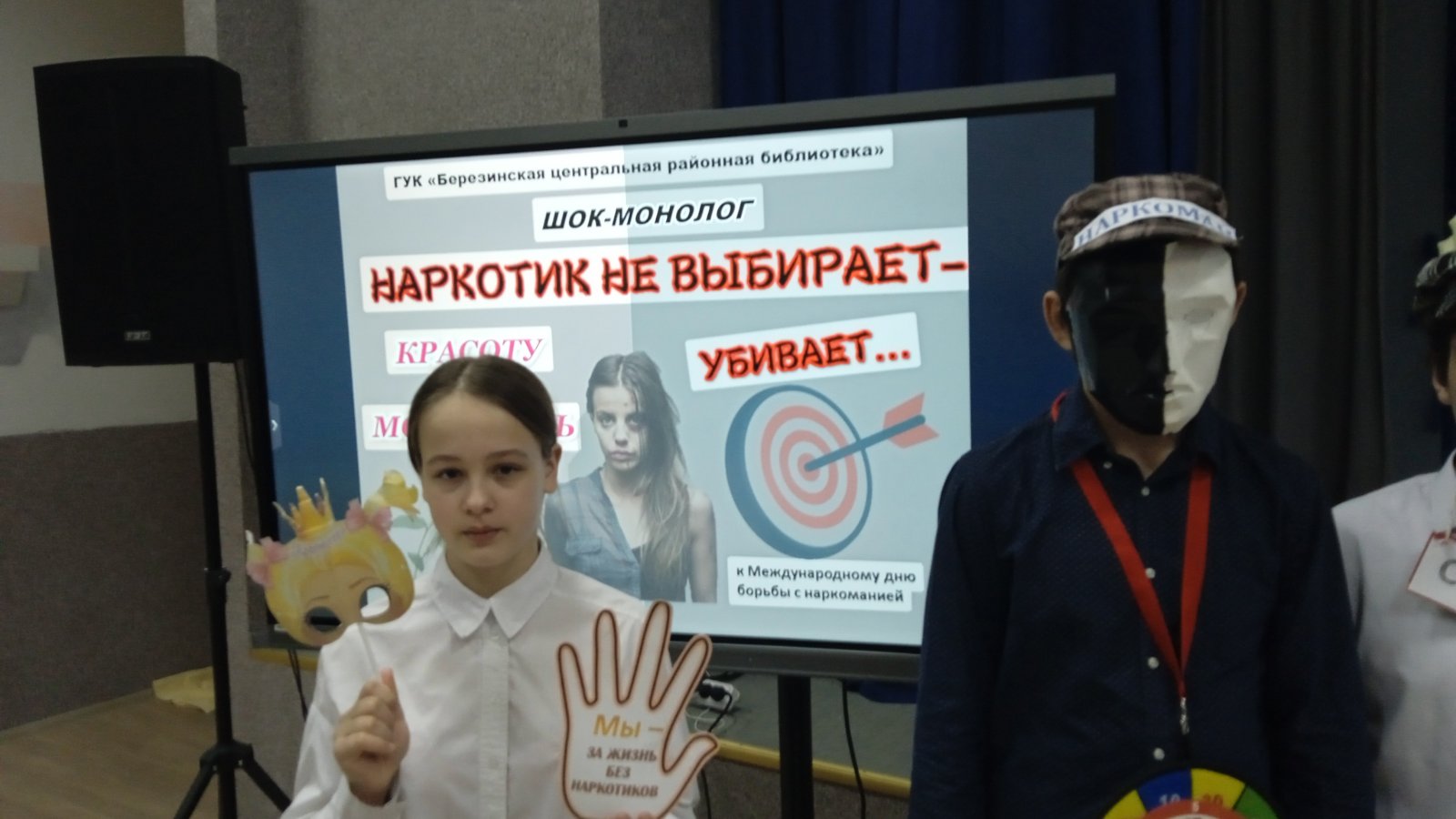 Наркомания - знак беды, знак трагедии. В группе риска 60 % населения в возрасте до 21 года, поэтому так актуален Международный день борьбы с наркоманией и наркобизнесом. Профилактическая работа со школьниками нацелена на разъяснение пагубности влияния наркотиков на молодой организм и осознание того, что от наркотика человечество ещё не придумало лекарство. Масштаб проблемы лучше всего виден на загубленных судьбах. Наркотик не выбирает, красоту и молодость убивает! Душевное потрясение у школьников СШ № 3 г. Березино вызвали представленные сотрудниками Березинской районной библиотеки исповеди юных жертв наркомании, практически вчерашних школьников, чья прежняя жизнь после первой же пробы изменилась окончательно ибесповоротно. Каждый шок-монолог добавил штрихи на полотно представлений острашной проблеме наркозависимости , о семейной трагедии, где есть наркоман, о невозможности вернуть к нормальной жизни тех, кого забрали в плен наркотики. Юным слушателямбыл адресован простой дельный совет : «Говори наркотикам НЕТ!»