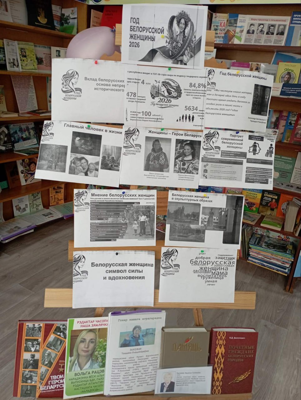 Сотрудником библиотеки к мероприятию была оформлена иллюстрированная выставка «2026 – Год белорусской женщины», где широко были представлены материалы по предлагаемой теме.