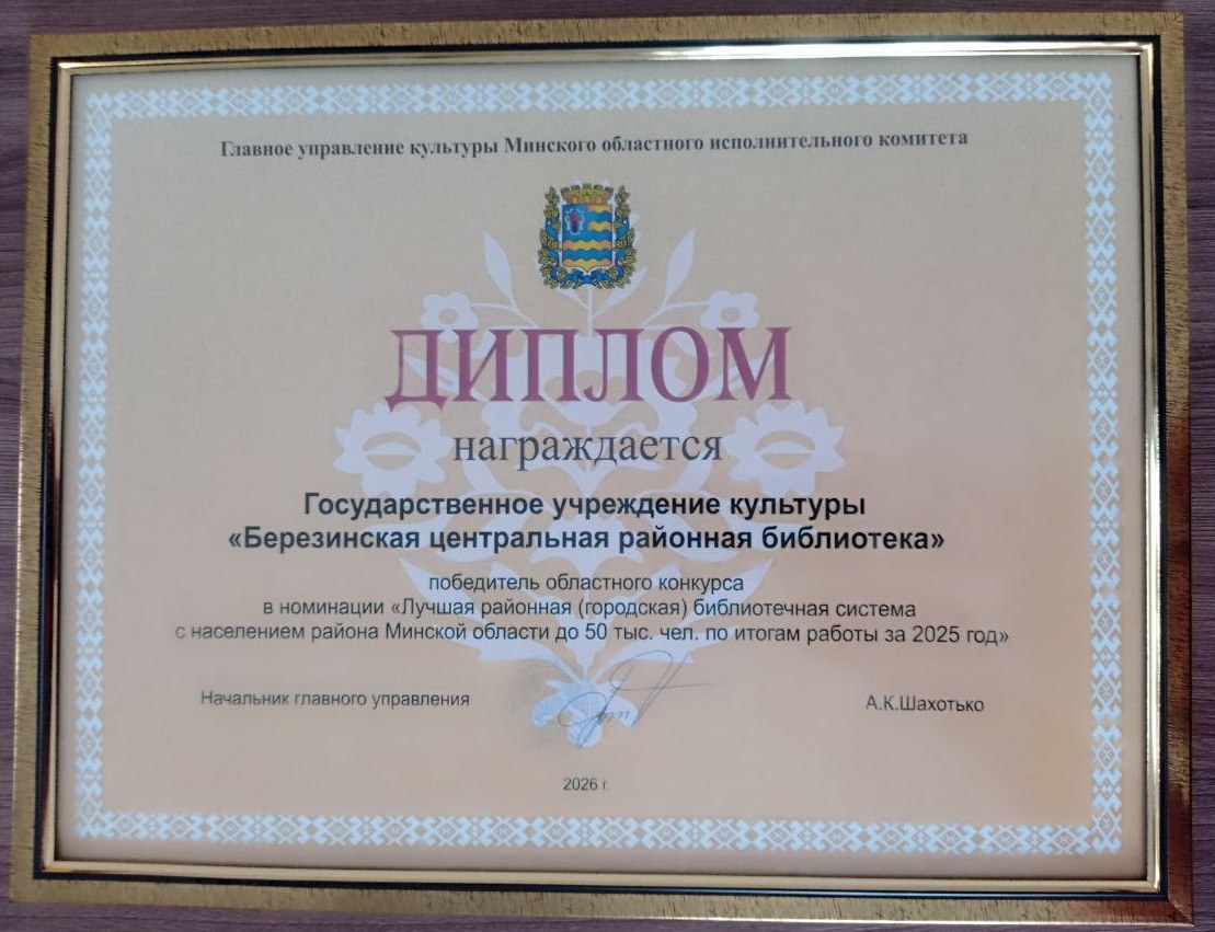 Государственное учреждение культуры «Березинская центральная районная библиотека» признано лучшим среди библиотечных систем с населением района Минской области до 50 тысяч человек по итогам работы за 2025 год.