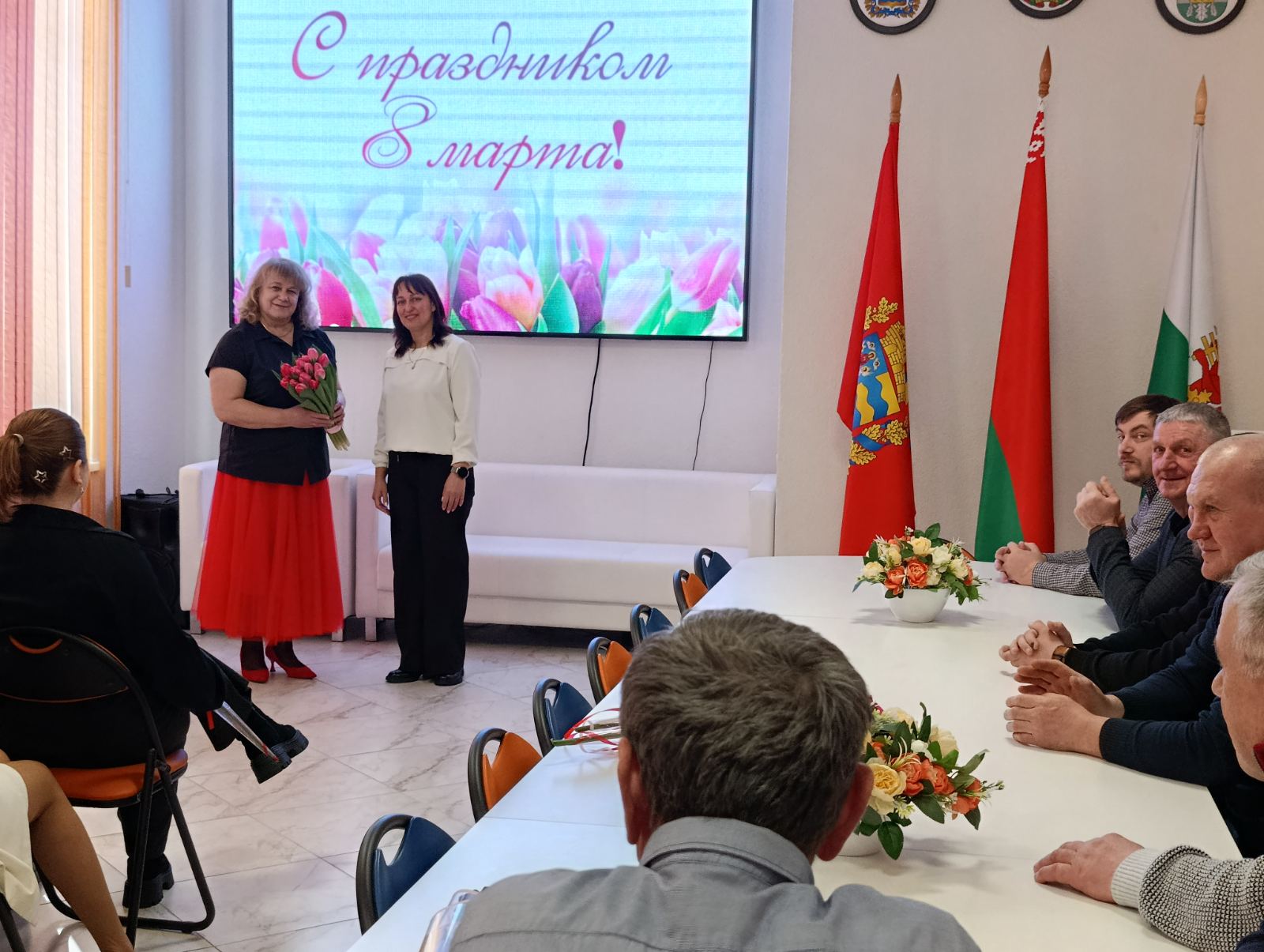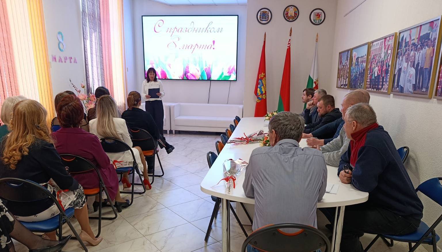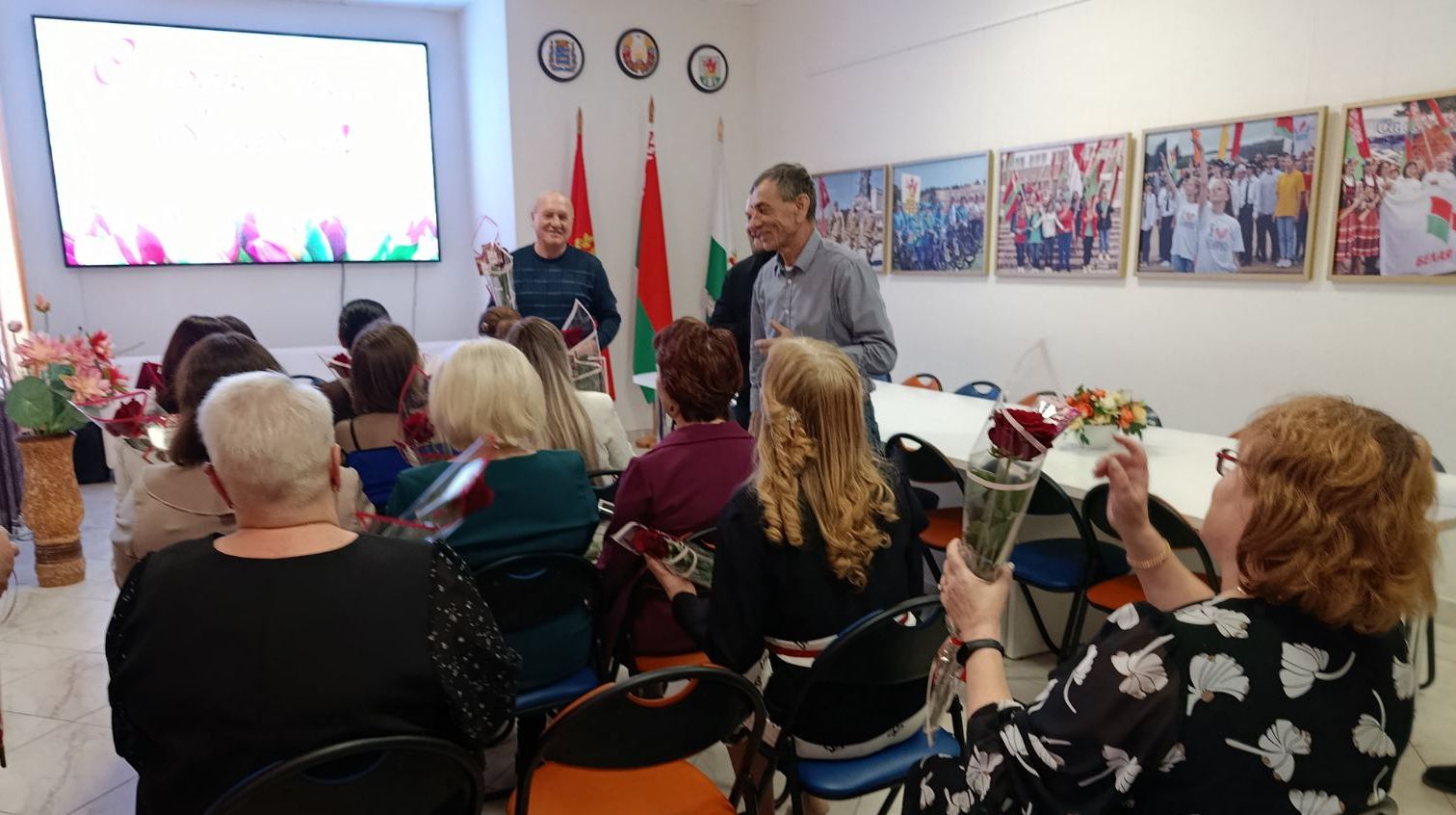В канун светлого весеннего праздника – Дня женщин - боевая гвардия мужчин ГУК «Березинская центральная районная библиотека» поздравила прекрасную половину коллектива с этой замечательной датой календаря. Понятия ЖЕНЩИНА и ВЕСНА удачно рифмуются, отражая возвышенную сущность женского начала – символа жизни, носителя всего прекрасного в этом мире. Во время поздравления мужчины районной библиотеки не пожалели добрых слов, искренних пожеланий, виртуозных шуток и алых роз, привнося в весенний мартовский день особо торжественную ноту. А Владимир Керин в качестве шикарного подарка исполнил под гитару песню – посвящение женщинам – романтичным, влюблённым, любимым…