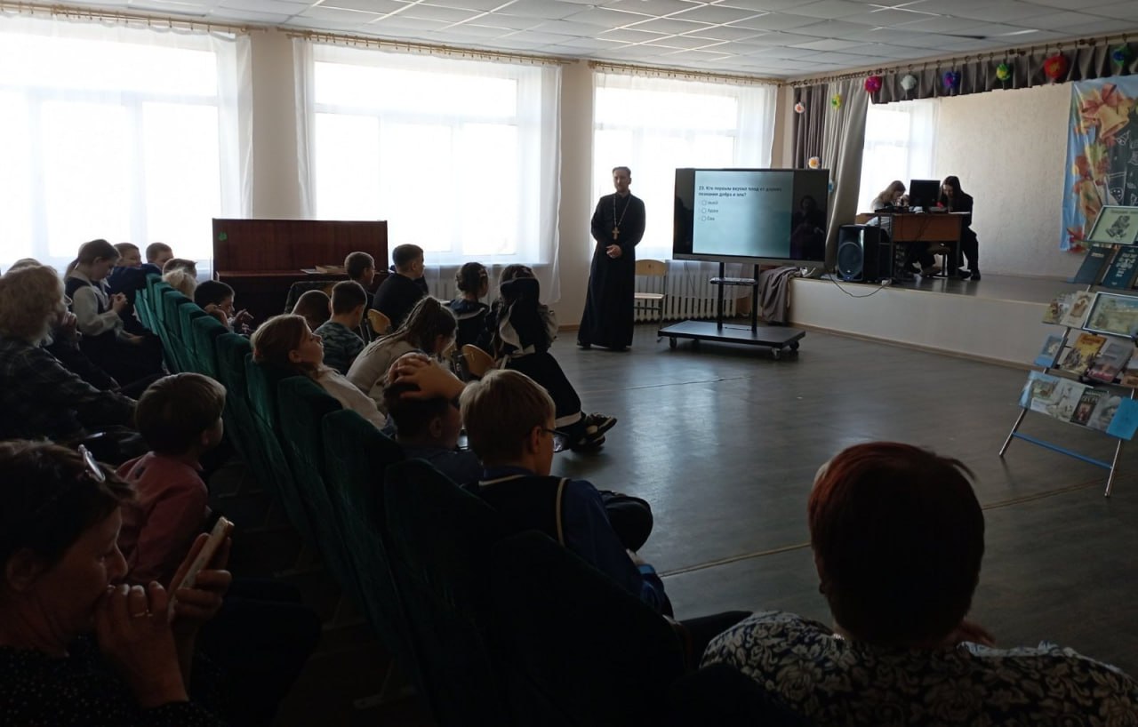 На мероприятии присутствовал настоятель Храма Преображение Господня г. Березино и священноисповедника Владимира Хираско а.г. Погост иерей Василий который рассказал о том, как влияет духовная книга на внутренний мир человека, его жизнь, поделился примерами из собственного опыта. Затем для закрепления услышанного материала он предложил ребятам игру-тест «Сотворение мира и человека». Дети активно отвечали на вопросы и с большим интересом участвовали в обсуждении.