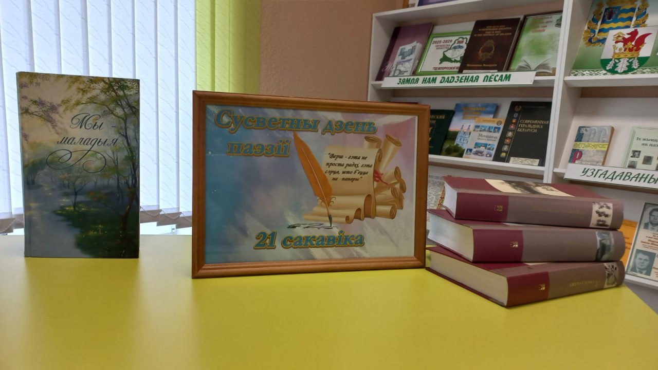 21 сакавіка – Сусветны дзень паэзіі. Свята адзначаецца з 1999 года па рашэнні ЮНЕСКА з мэтай «надаць новы імпульс і новае прызнанне нацыянальным, рэгіянальным і міжнародным паэтычным рухам». Паэзія – гэта адзін з асноўных тыпаў мастацтва слова, эмацыянальна-вобразная вершаваная творчасць, якой уласцівы шырокае ўжыванне адмысловых слоўных вобразаў, настроенасць на яркія, прыгожыя, гарманічна выказаныя пачуцці і думкі. Геніяльны Леанарда да Вінчы называў яе «жывапісам, які чуеш», а нямецкі пісьменнік Іаган Гердэр «музыкай душы». Здабыткі старабеларускай паэзіі памнажаліся на працягу многіх стагоддзяў плёнам працы шматлікіх майстроў вершаванага слова. Найлепшым жа нацыянальным песнярам прысвойваецца ганаровае званне народнага паэта. Першымі народнымі паэтамі Беларусі сталі Янка Купала і Якуб Колас. Пазней гэтае званне атрымалі Пятрусь Броўка, Аркадзь Куляшоў, Максім Танк, Пімен Панчанка, Ніл Гілевіч і Рыгор Барадулін. Зборнікі іх вершаў прадстаўлены на тэматычнай выставе ”Зоркі беларускай паэзіі” аформленай" у Бярэзінскай раённай бібліятэцы.