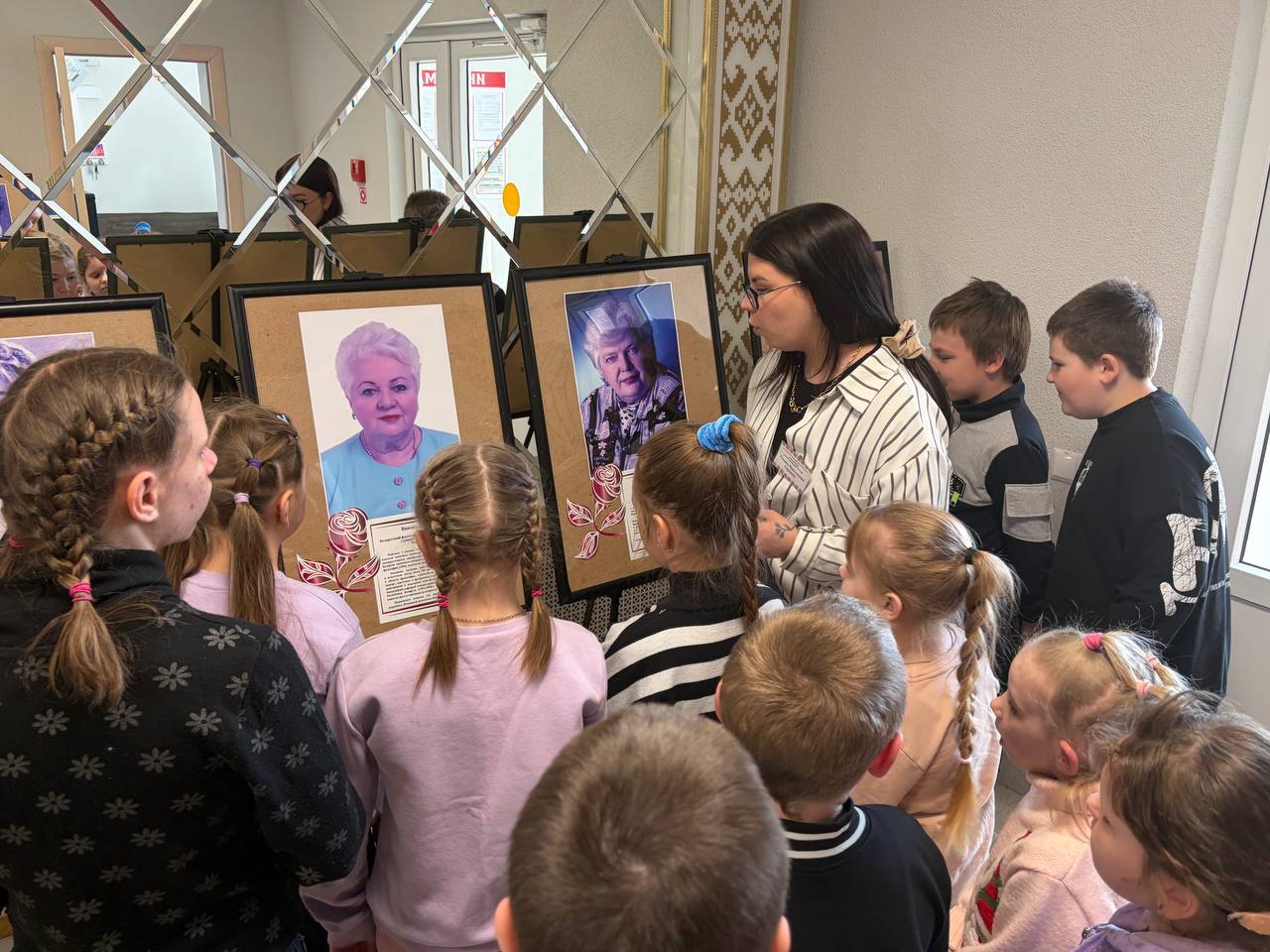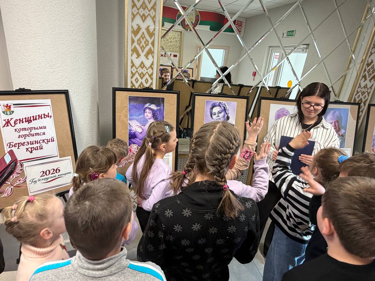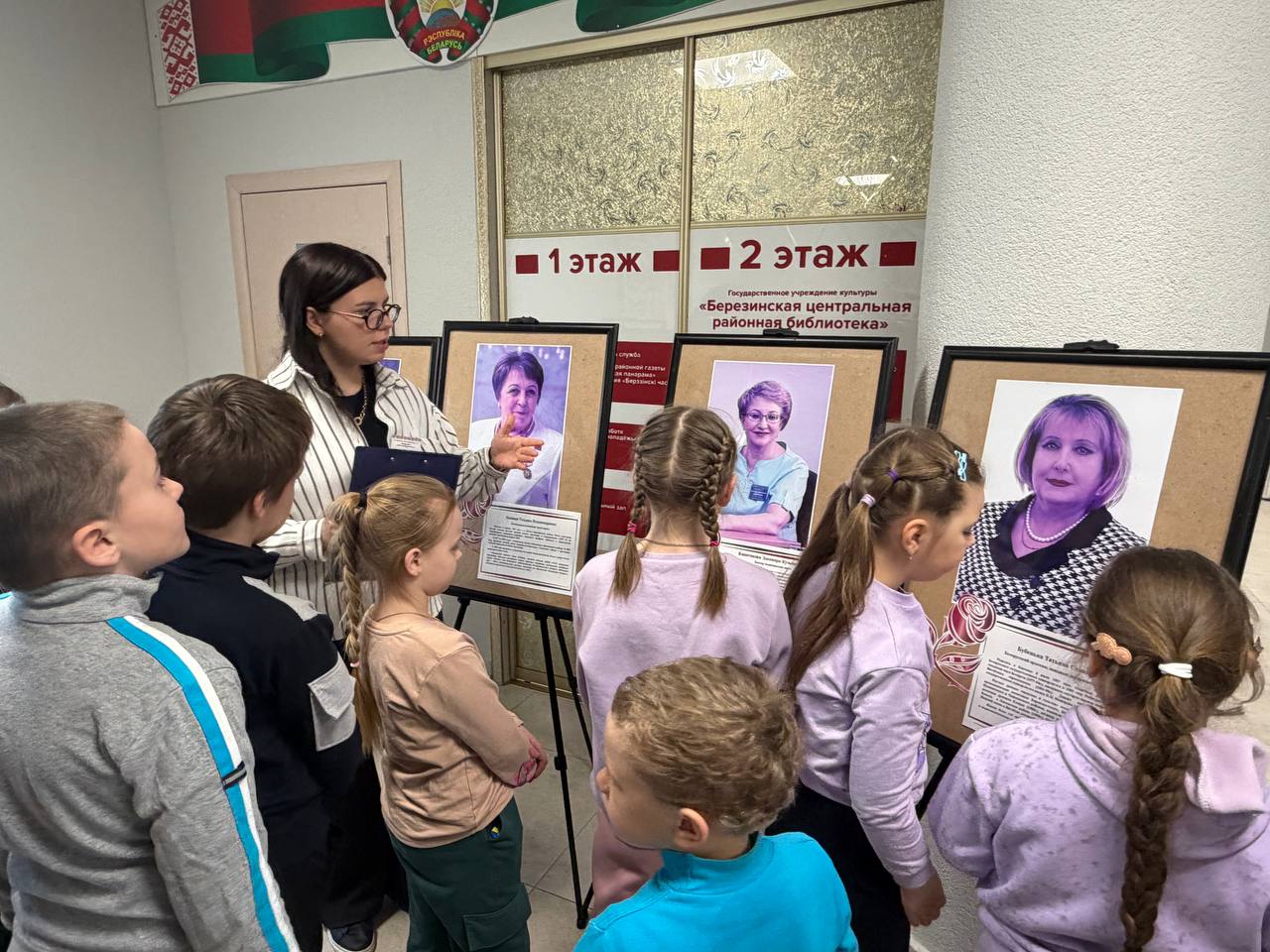 Путешествие в мир знаний началось прямо с порога. На первом этаже библиотекарь детско-юношеского сектора Ульяна Горошко познакомила школьников с тематической выставкой, посвященной 2026 году — Году белорусской женщины. Экспозиция «Женщины, которыми гордится Березинский край» представила галерею судеб выдающихся землячек: