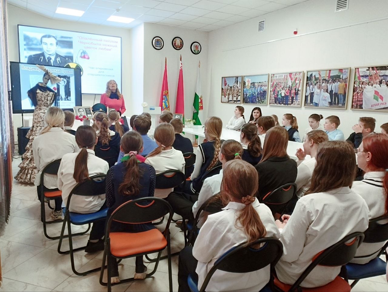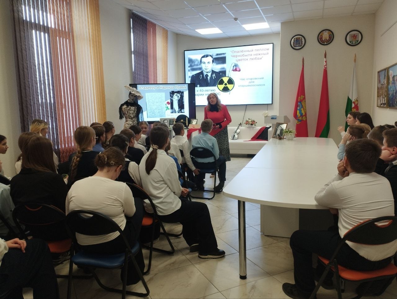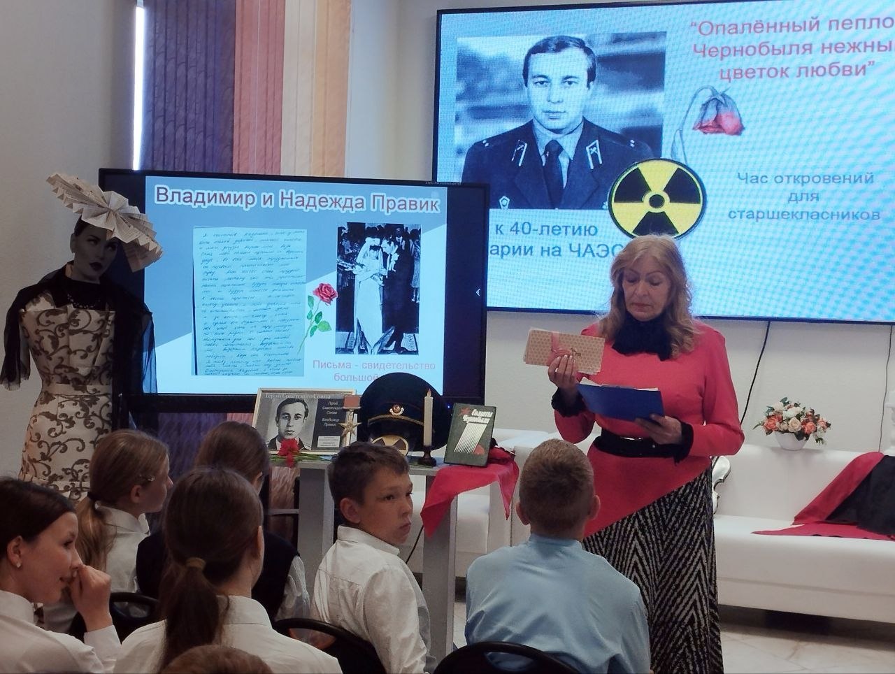 Масштабы трагедии аварии на ЧАЭС, разразившейся 40 лет назад, доходчивей всего представить юным современникам через людские судьбы. Сотрудники Березинской районной библиотеки адресовали 7-классникам СШ №2 г. Березино проникновенный час откровений «Опалённый пеплом Чернобыля нежный цветок любви». Это история большой, чистой любви, убитой маленьким коварным атомом. Слушателей покорило трепетное чувство лейтенанта пожарной службы Владимира Правика и студентки музыкального училища Надежды, где было так много солнца, радости и любви до зловещей даты 26 апреля 1986. За 4 года их знакомства и супружеской жизни – 800 писем, которые теперь бережно хранятся в семейном архиве вдовы легендарного пожарного, Героя Советского Союза В. Правика. В 16 лет она – счастливая невеста, в 20 лет – печальная вдова. Выдержки из писем влюблённых, факты их знакомства и семейной жизни, страницы очерка-посвящения Г. Ковтун «Жили, как лебеди» из сборника «Солдаты Чернобыля», поэтические строки Л. Ошанина прозвучали балладой мужества, боли и верности. Не зря парни, присутствующие на мероприятии, захотели примерить фуражку пожарного, а девочки – стали мечтать о такой настоящей, большой любви, не подвластной времени.