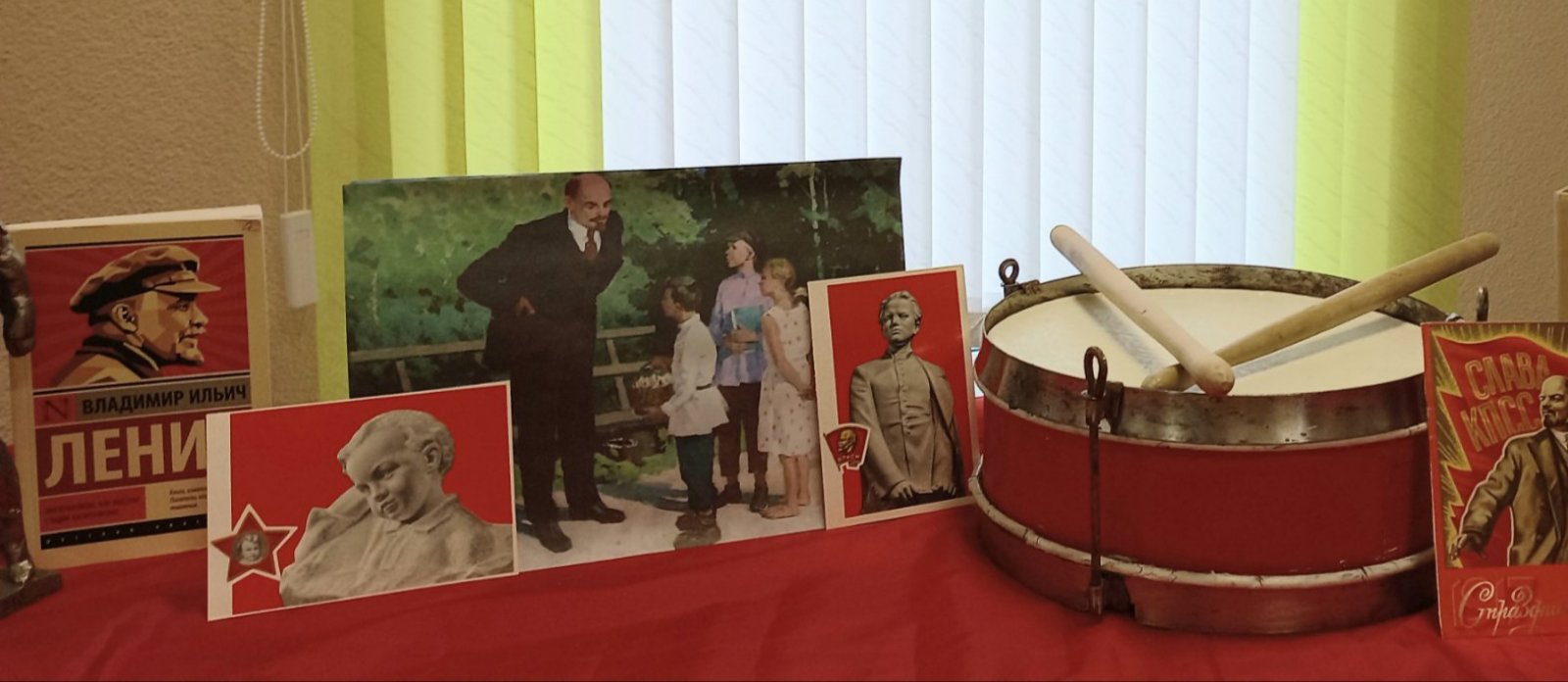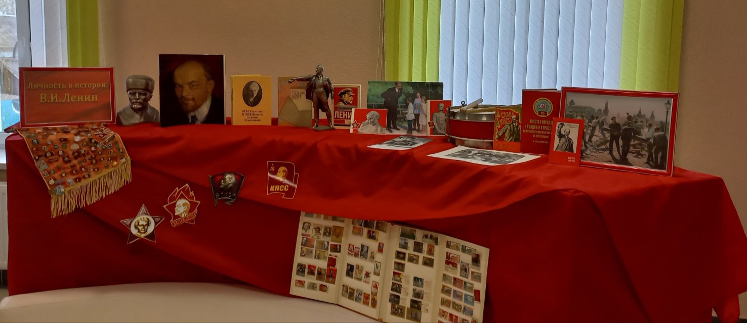 На выставке представлены книги о детстве Владимира Ильича, его родителях, о выборе жизненного пути, начале политической деятельности. Также его труды: сочинения, статьи, которые публиковались в первых газетах: «Искра», «Пролетарий», «Правда». Книжный ряд дополняют экспонаты той эпохи, когда ведущей силой общества была партия и комсомол, коллекция значков и марок СССР серии «Лениниана» с изображением вождя мирового пролетариата, а также открытки с лозунгами того времени. Фотография первого коммунистического субботника с участием самого вождя пролетариата напоминает о положенной традиции ежегодно в апреле проводить субботники по наведению порядка с массовым охватом населения.